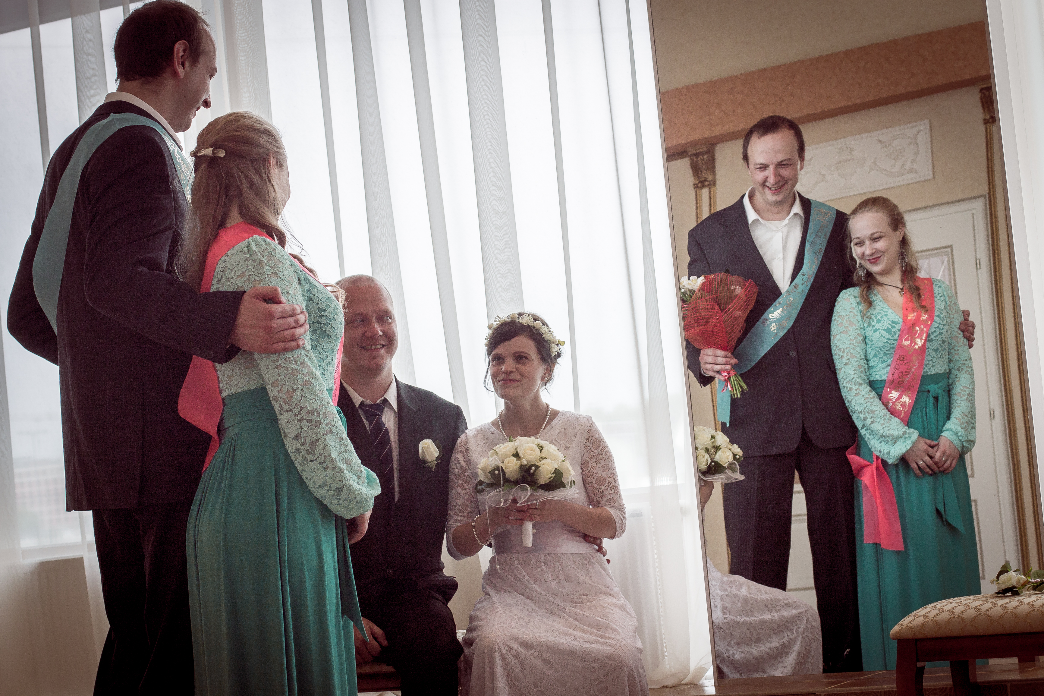 не совсем умещались в ракурсе и отражение в зеркалие свидетели и жених и невеста. изменила угол наклона горизонта. обрезать ради композиции жениха и невесты - терялась целостность. а по другому - не было отражения...