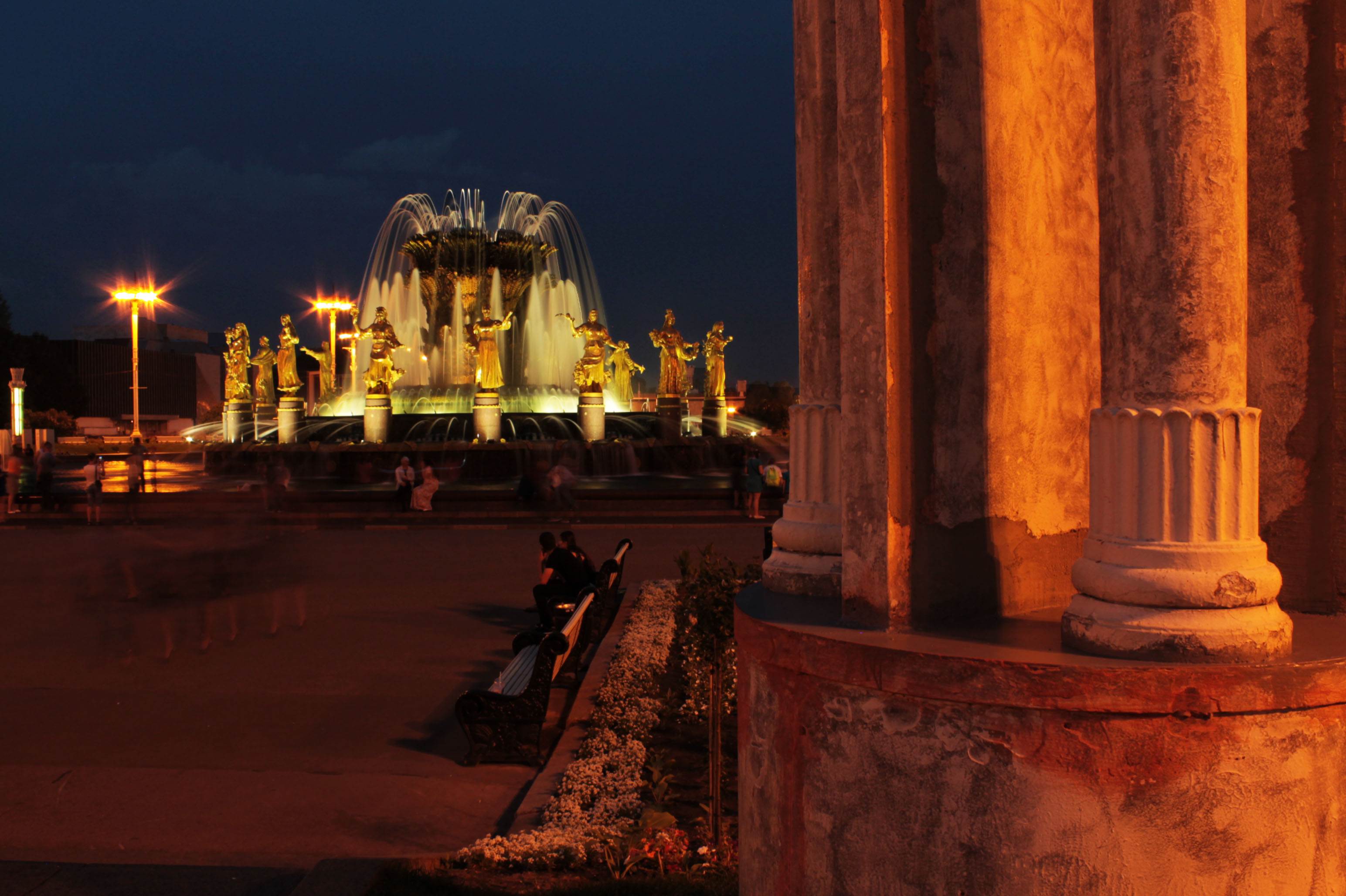 Съемка на длинной выдержке не только позволила сохранить при недостатке света минимальное ИСО, но и помогла очень эффектно сгладить струи фонтана.