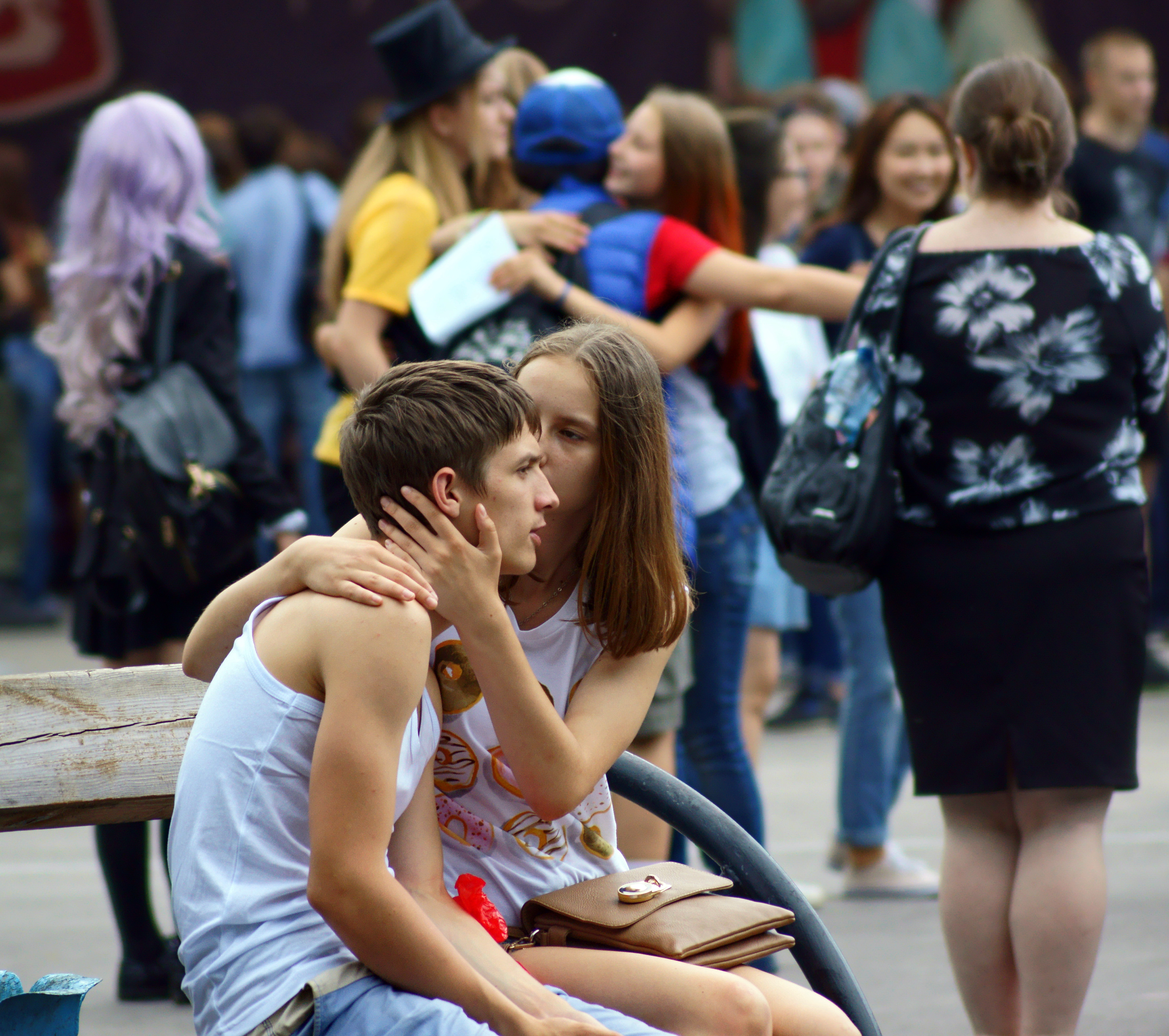 Молодежный фестиваль подходил к концу. Я встал с краю, прислонился к дереву, и снимал на пределе дальности объектива, оставаясь незамеченным для участников. Данная парочка привлекла меня своей отрешенностью, отделенностью от остального действия. И малая глубина резкости это удачно подчеркивает.