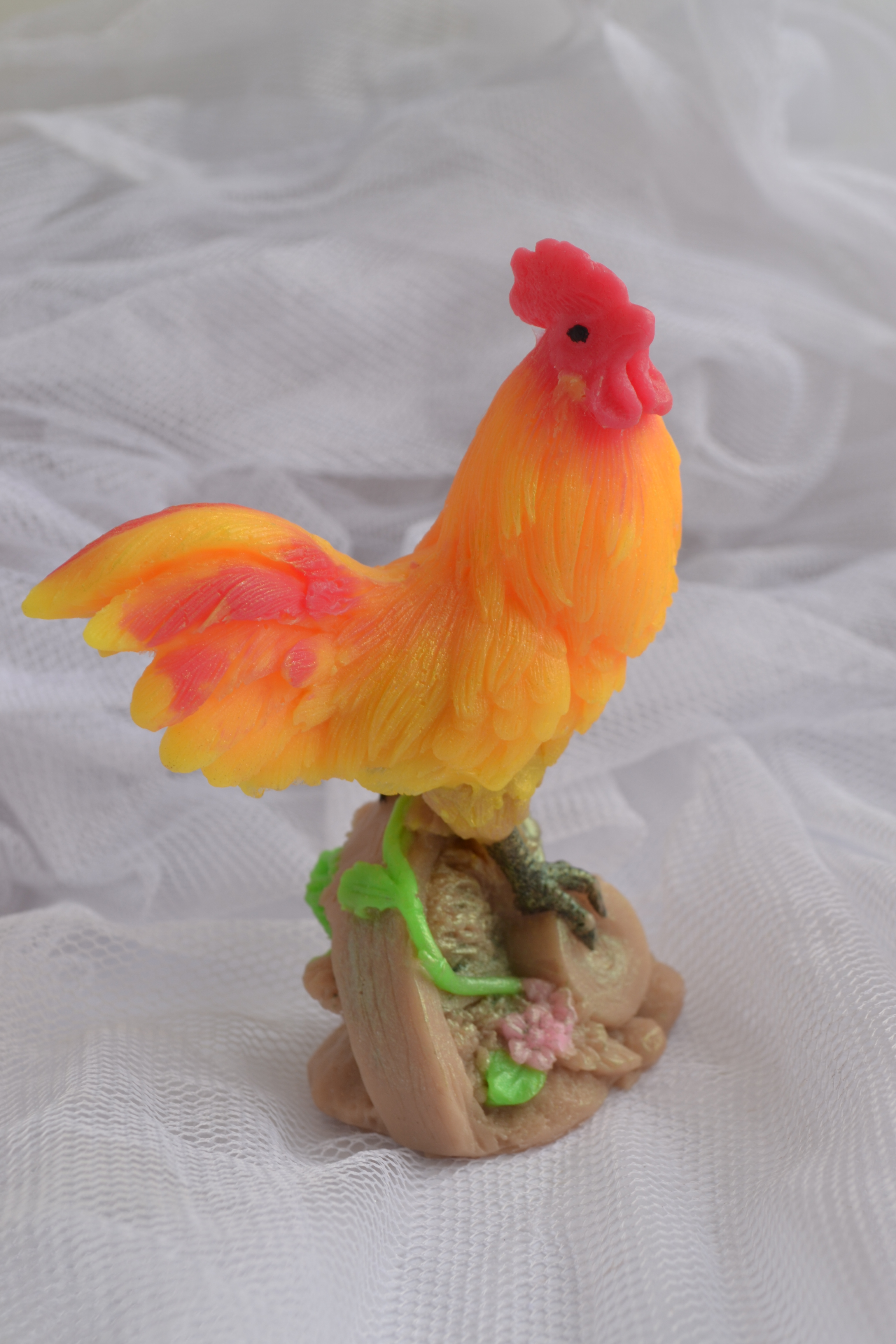 Петух яркий , он отлично выделяется на светлом фоне.