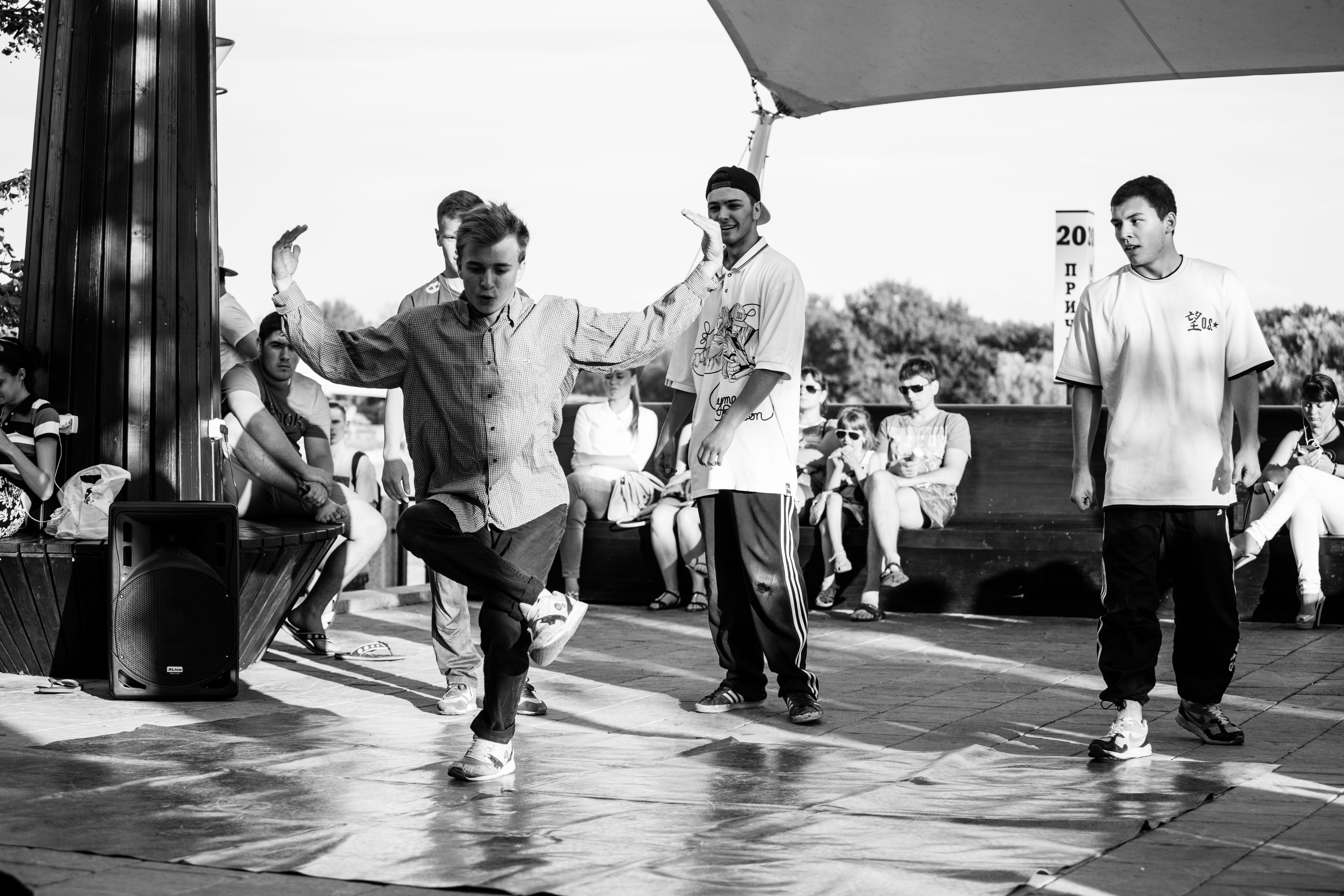 Здравствуйте. Снимал уличных танцоров вечером на набережной на прогулке. У выступающего свет соответствует позе - как весы.