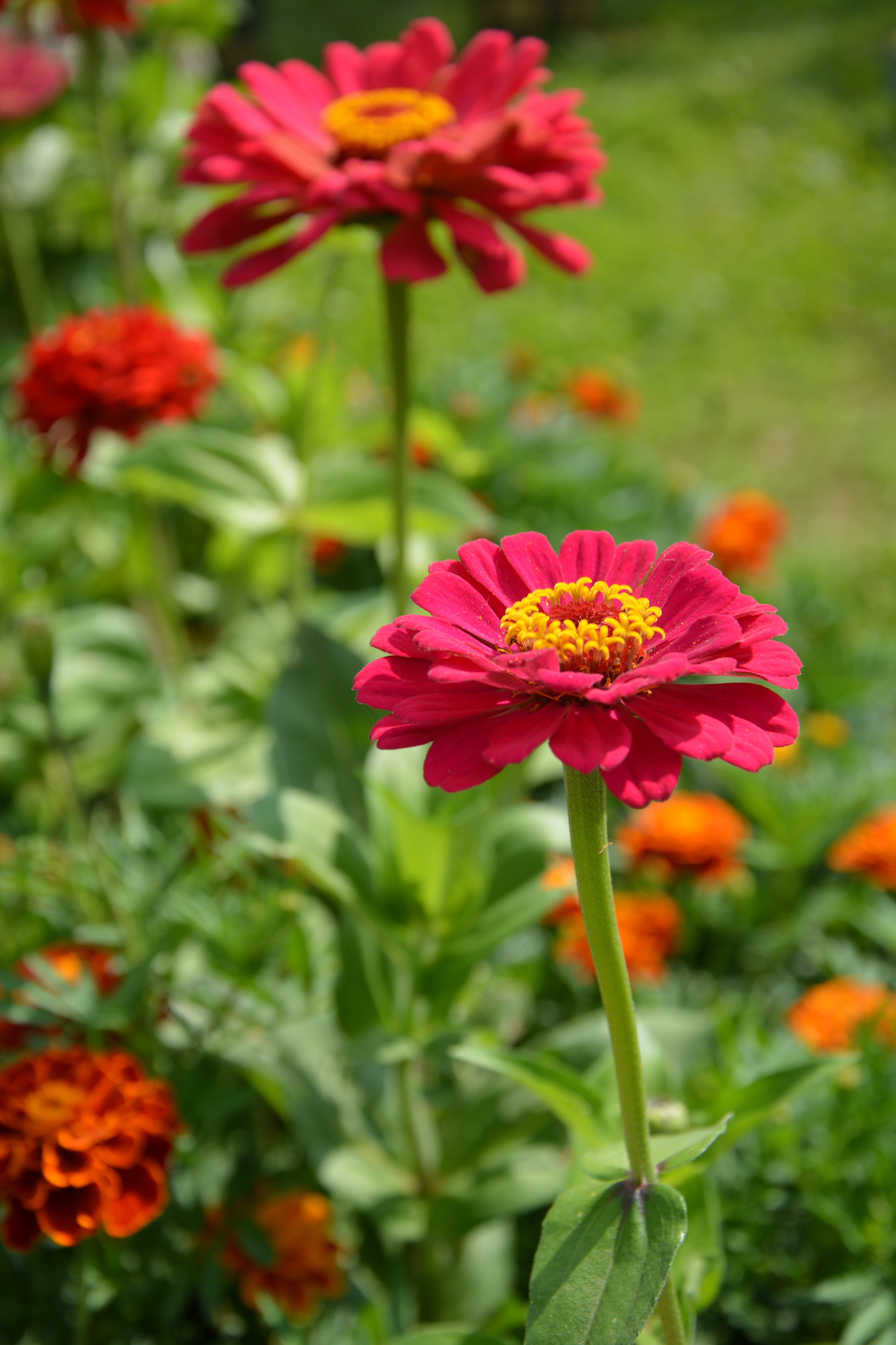 Циннии. Чтобы размыть фон была открыта диафрагма и подобрано расстояние, на котором объектив смог сфокусироваться и четко снять цветок.