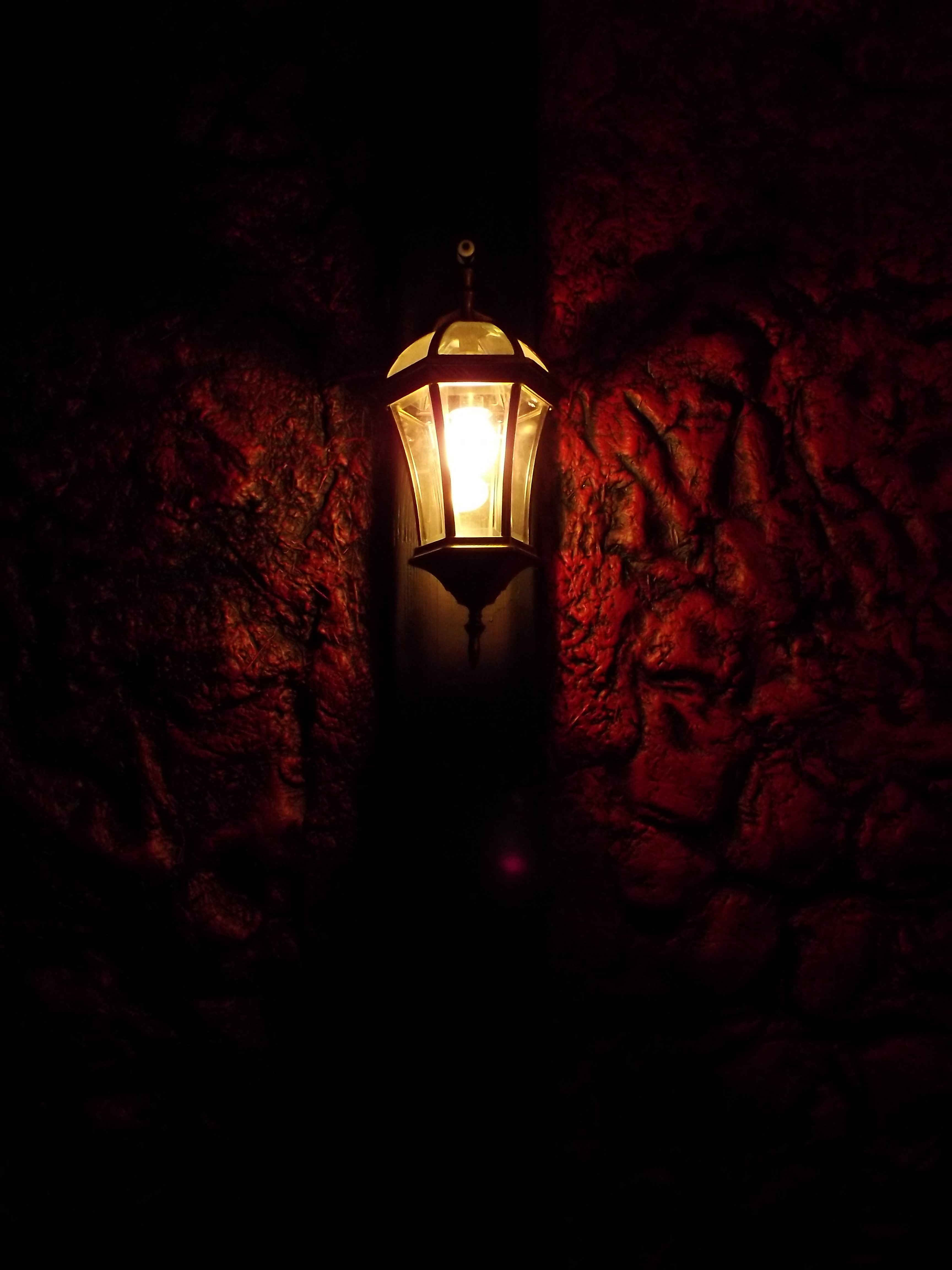 Красные фактурные и текстурные стены по бокам от фонаря также удачно дополняют общую композицию, жёсткий свет от фонаря придаёт кадру более графичный и жанровый вид. Общий свето-теневой рисунок выглядит объёмно и выразительно. Хорошо смотрится строгая центральная композиция.
