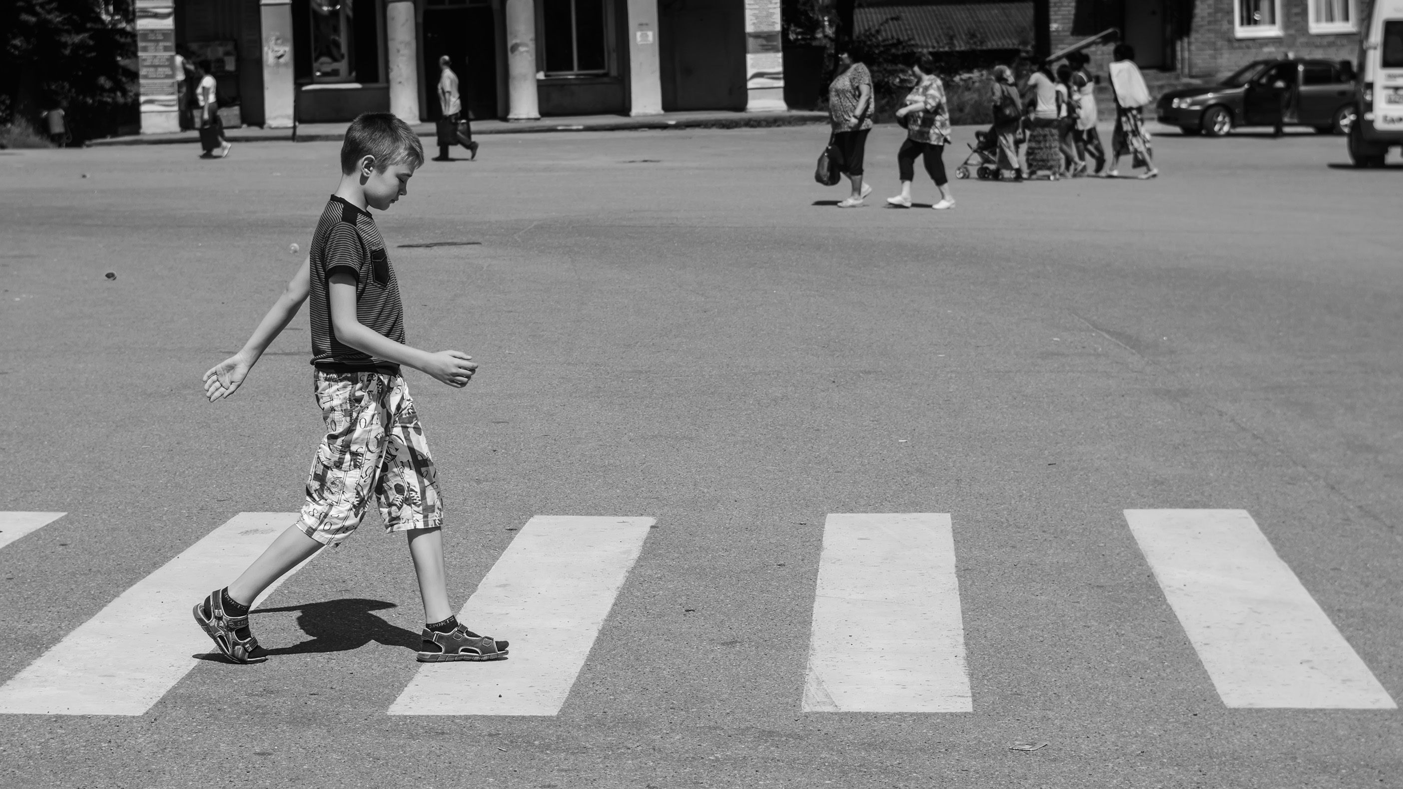 Снимок достаточно грамотно скомпонован, ребёнок размещён в композиционно выгодном месте, на линии третей, по направлению движения оставили достаочно визуального пространства.