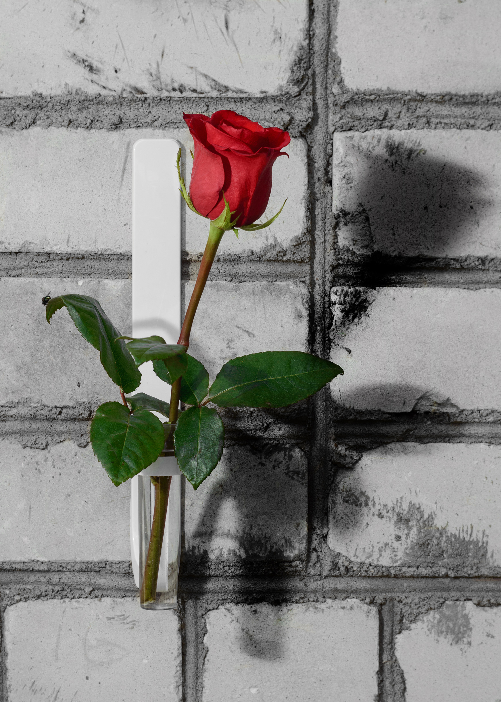Роза на стене. Красный живой цветок на фоне грубой бесцветной стены отбрасывает тень - свое плоское черно-белое подобие. При съемке использовался объектив Гелиос-44-2, диафрагма 8, вспышка.