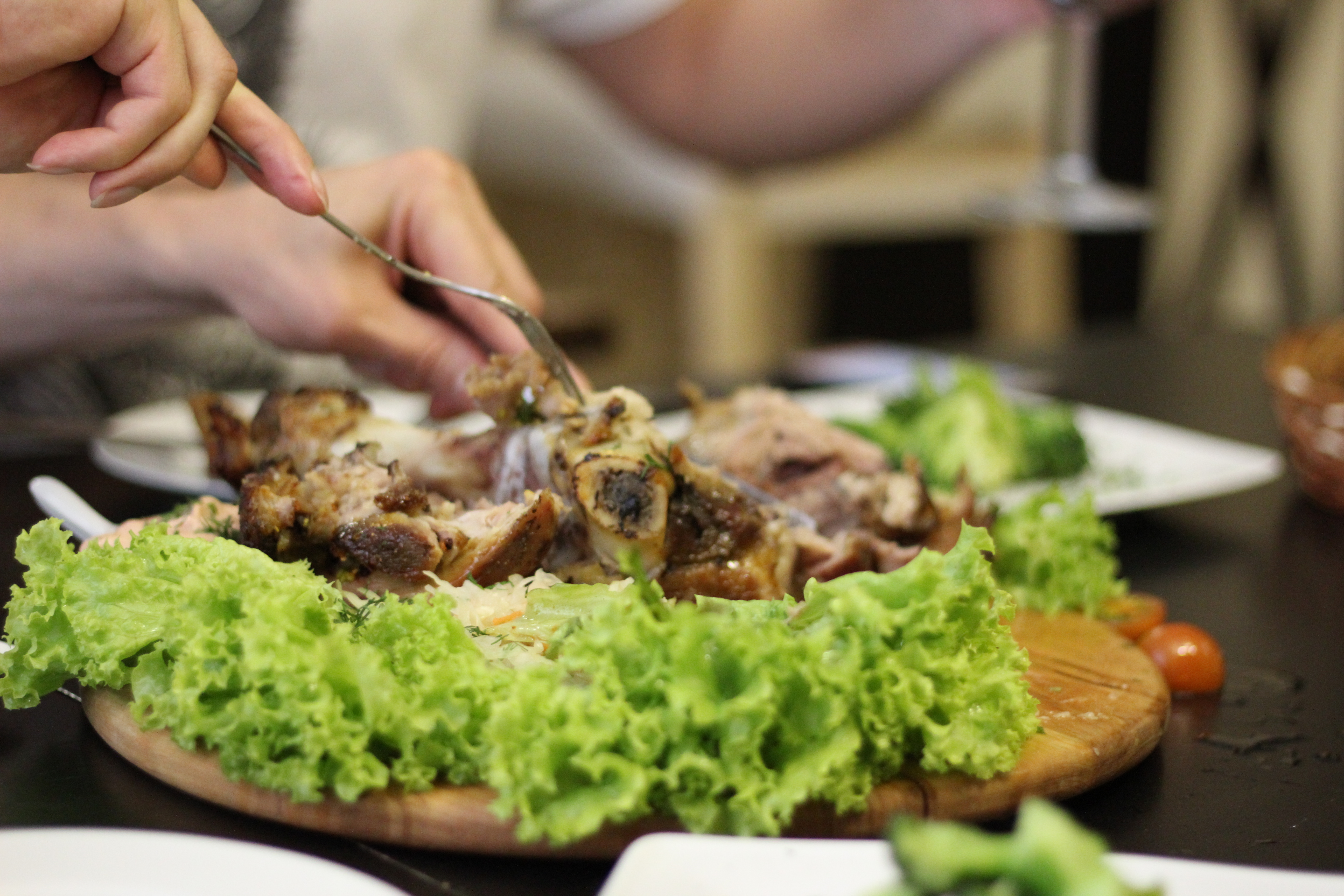 Так как снимали в условиях недостаточного освещения, поднять исо было верным решением, позволившим добиться короткой выдержки 1/60 и избежать смаза. Диафрагма, открытая до F2 позволила выделить объект съёмки (блюдо) резкостью, а фон увести в нерезкость.