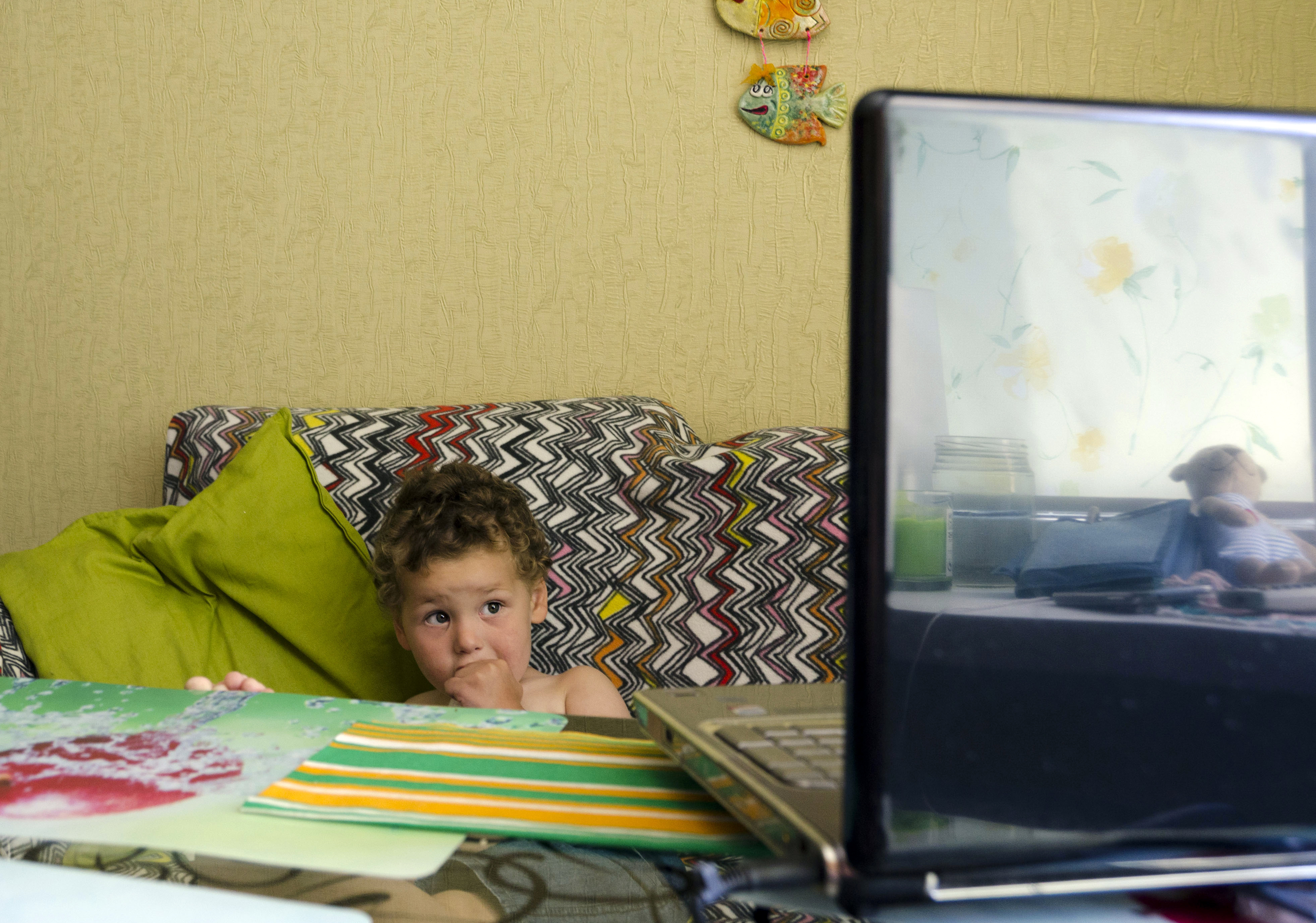 Классный сюжет получился, выразительный момент поймали - как будто мальчик увидел что-то страшное, видимо фильм какой-то смотрит. И не зря включили ноутбук, без него бы сюжет не так хорошо читался :)