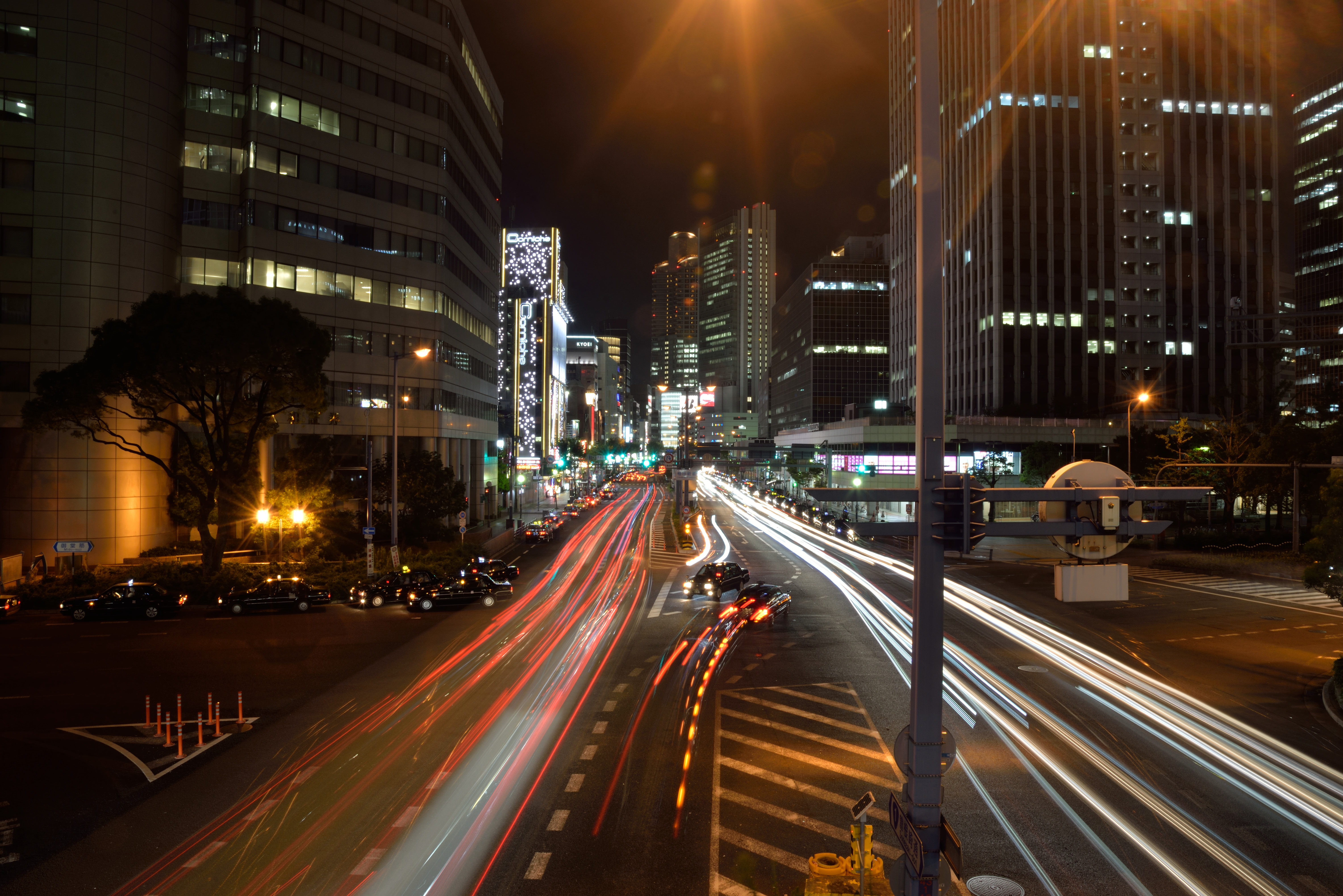 Ночной вид на Осаку. Кажется моя первая подобная фотография. У меня нет штатива, но перила моста вполне заменили штатив для данной задачи. Не определился, хорошо или плохо наличие светового шума от фонаря сверху.