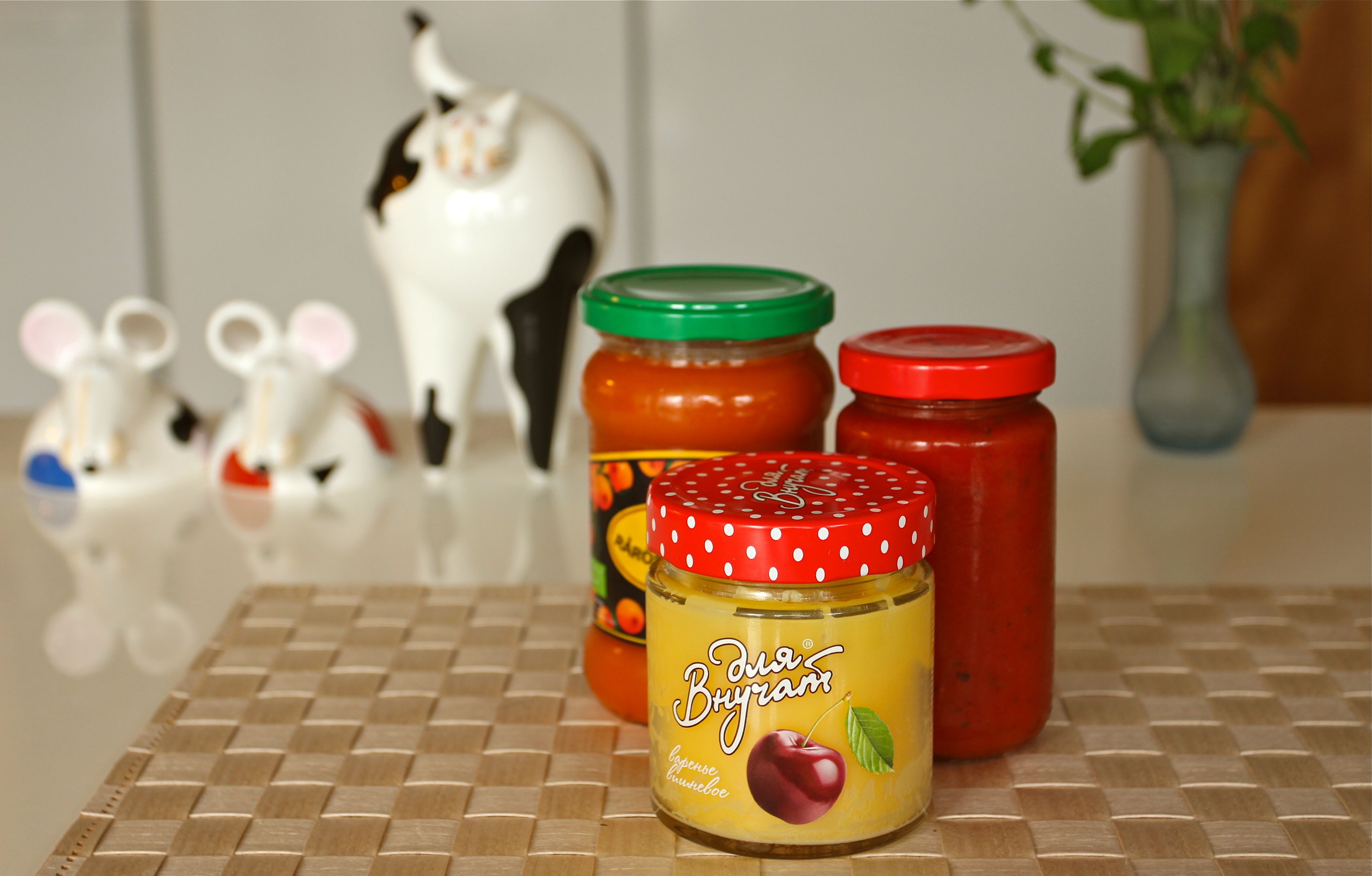 Объекты в расфокусе, но тем не менее читаются зрителем. Их было бы хорошо заменить на что-то тематическое - например, корзинку с вишнями, раз на баночке нарисована вишня.