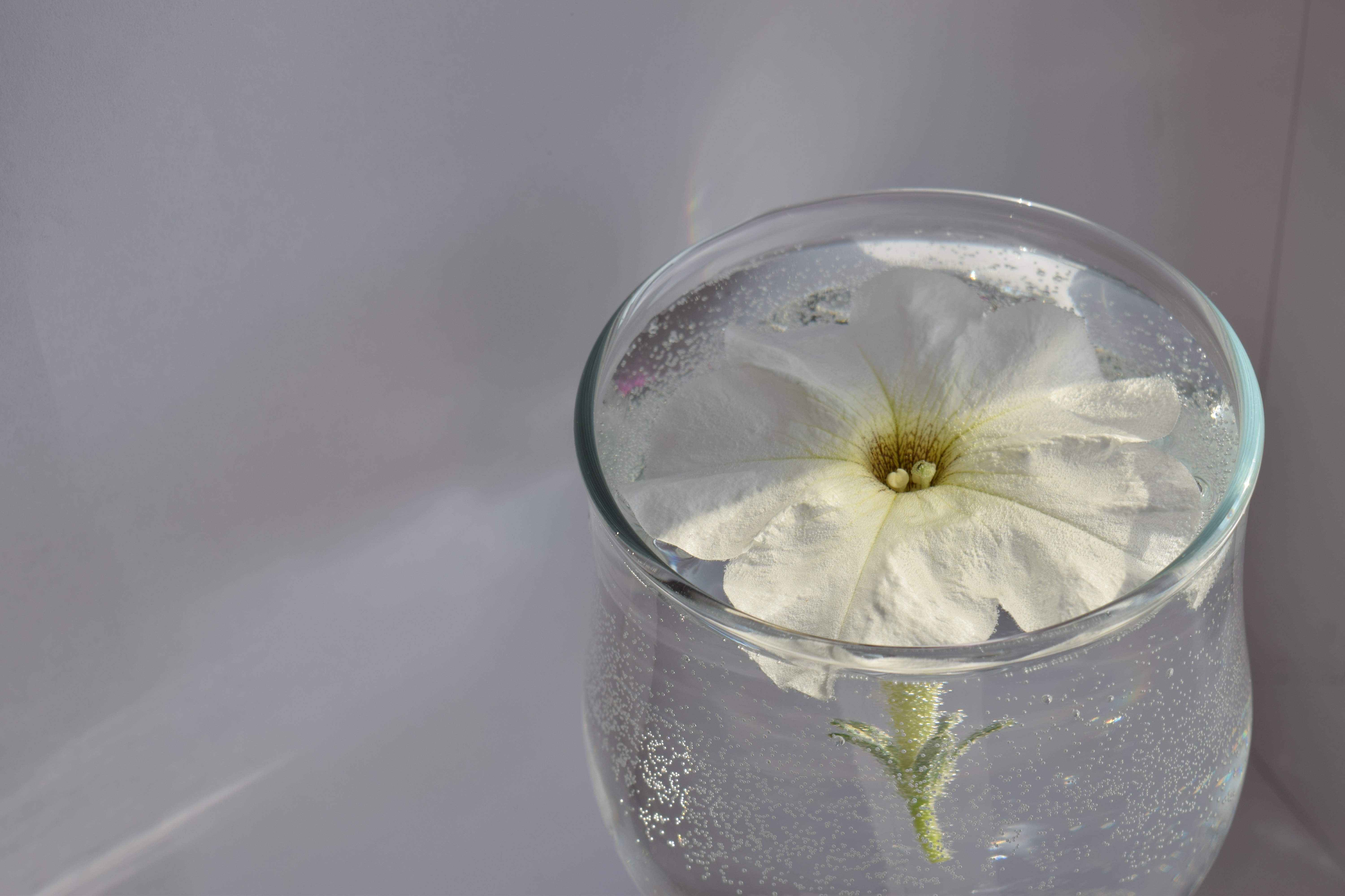 Для домашнего задания "Белое на белом" выбран цветок петунии в бокале с водой на подоконнике. Диафрагма 11 (может, нужно было открыть шире, но мне показалось, что слишком свело получится), выдержка 1/100