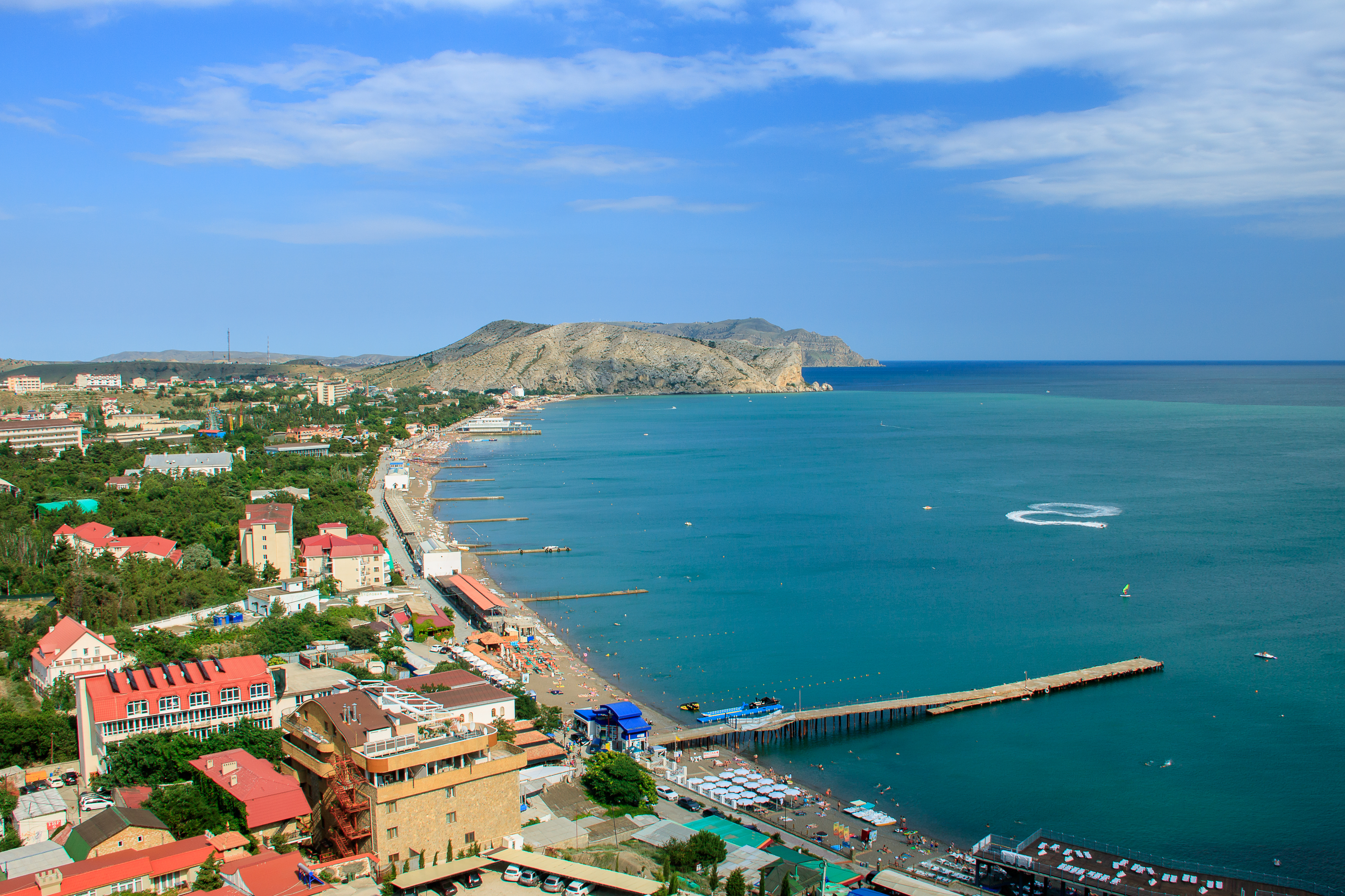 Панорама города Судак, вид с горы. Все пляжи как на ладони. А еще удалось поймать рисунок от водного мотоцикла на воде