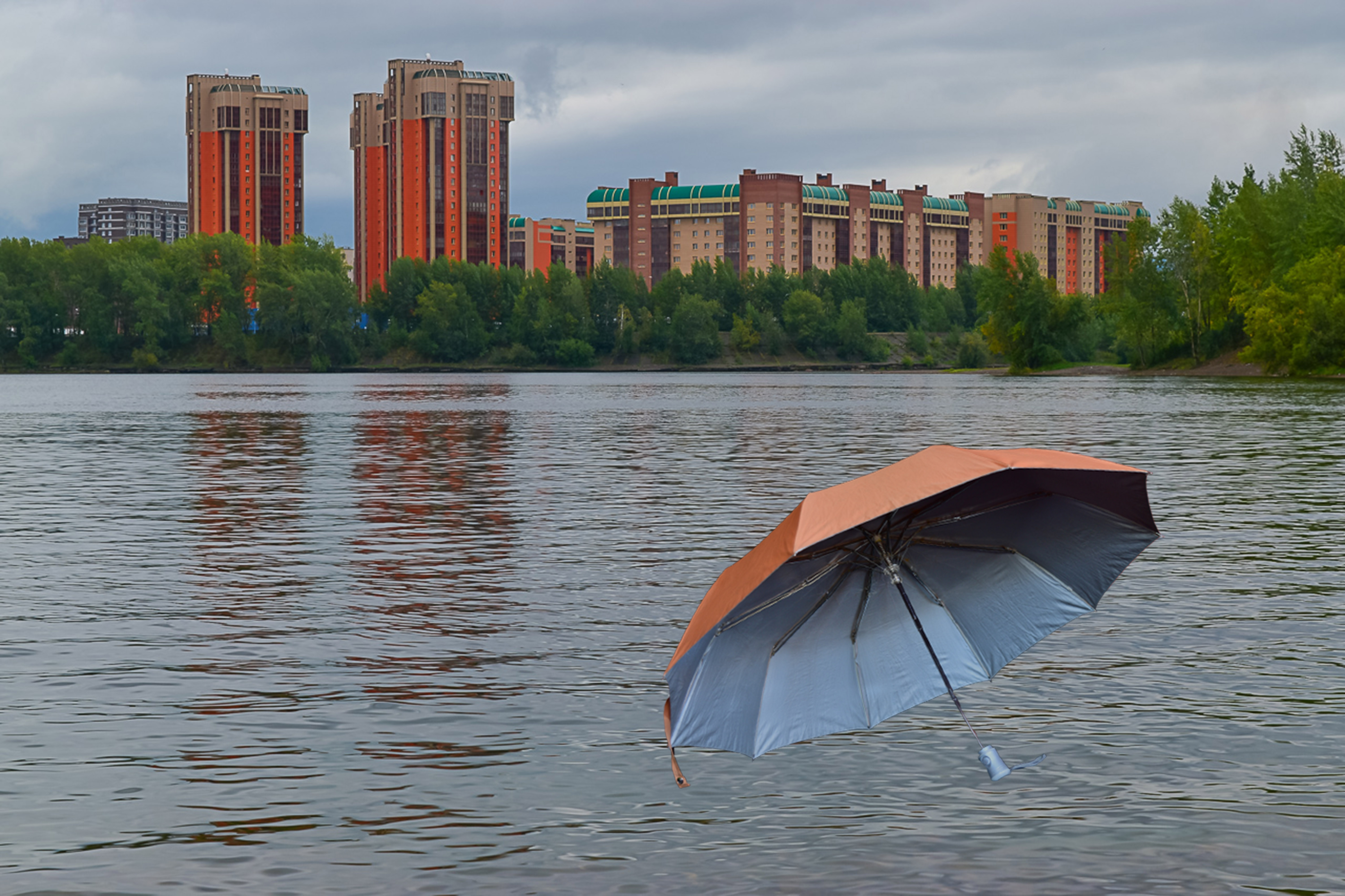 Зонтик находится в активной части кадра, устремляется к башням в фоне . Все планы сюжет взаимосвязаны.