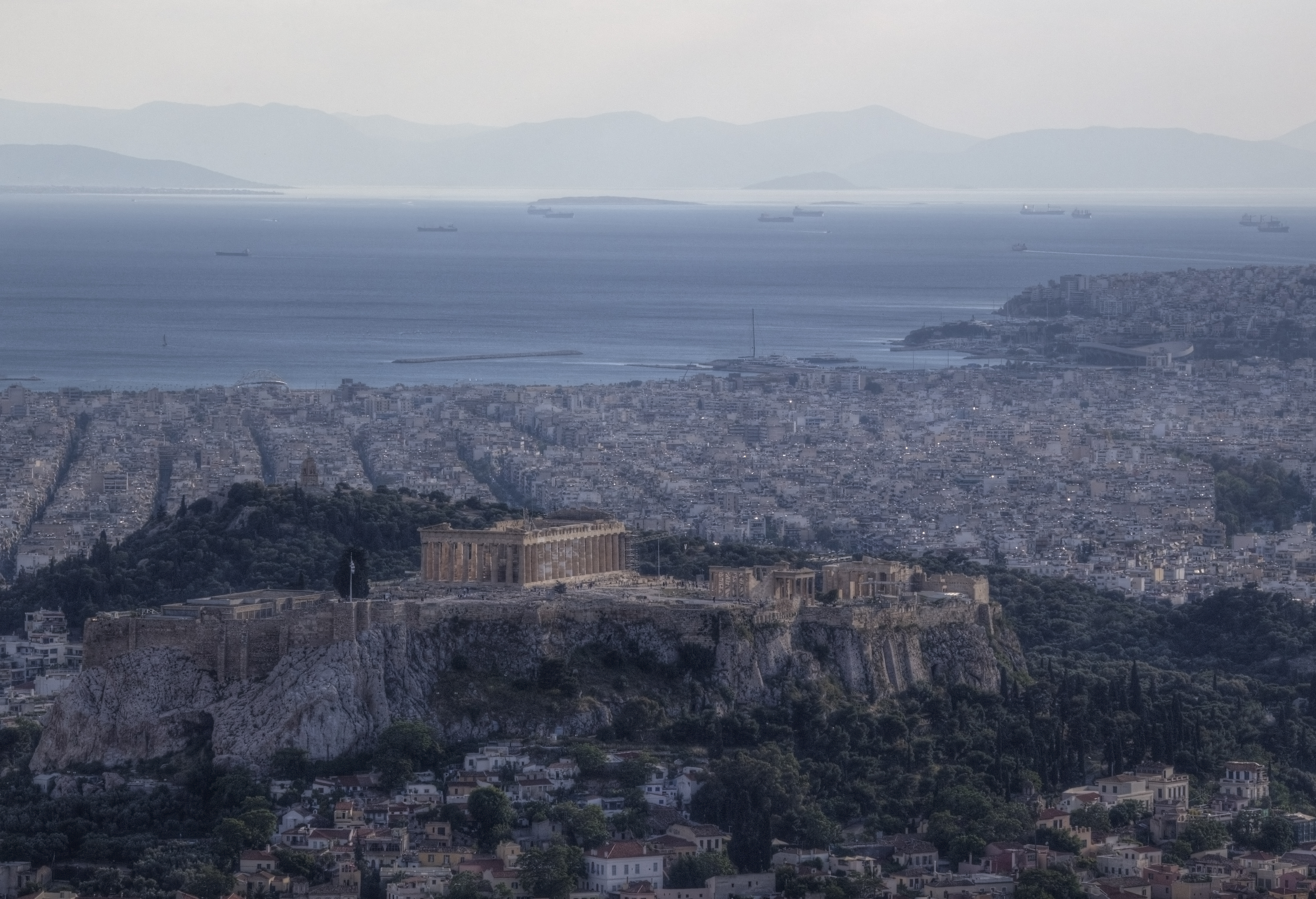 Афины. Вид на акрополь и храм Парфенон. Прорабатывая компоновку кадра обратил внимание на многоплановость сцены. Постарался основной акцент сделать на акрополь. Съемка с рук. Сейчас понимаю, что диафрагму можно было установить на f/11.