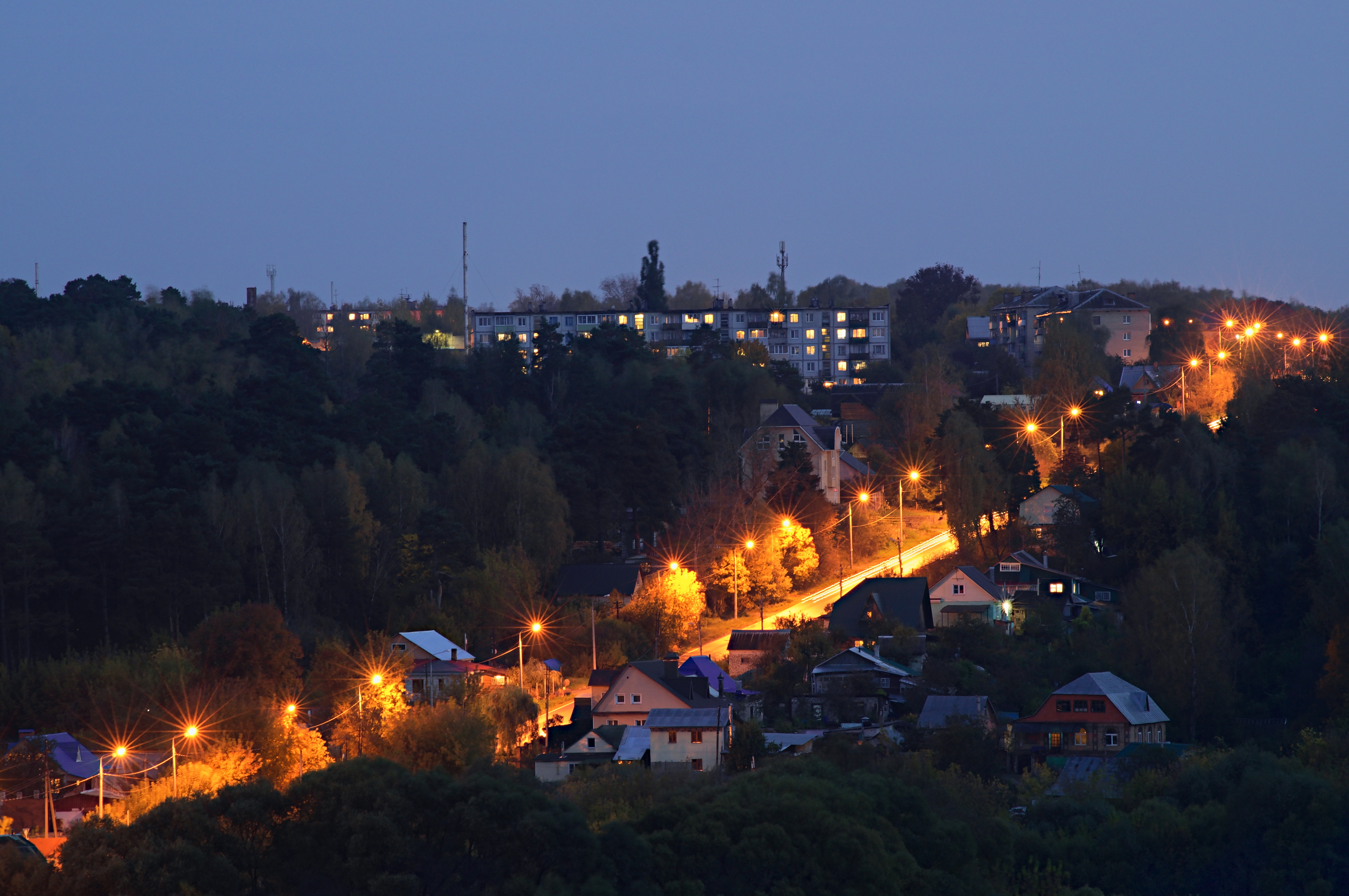 Но почти всё вышло резко. Деревья чуть размазались, но нельзя сказать, что это критично. Картина в жанре ночного городского пейзажа смотрится привлекательно, планы удачно раскрыты с высокой точки и сближены при помощи телеобъектива.