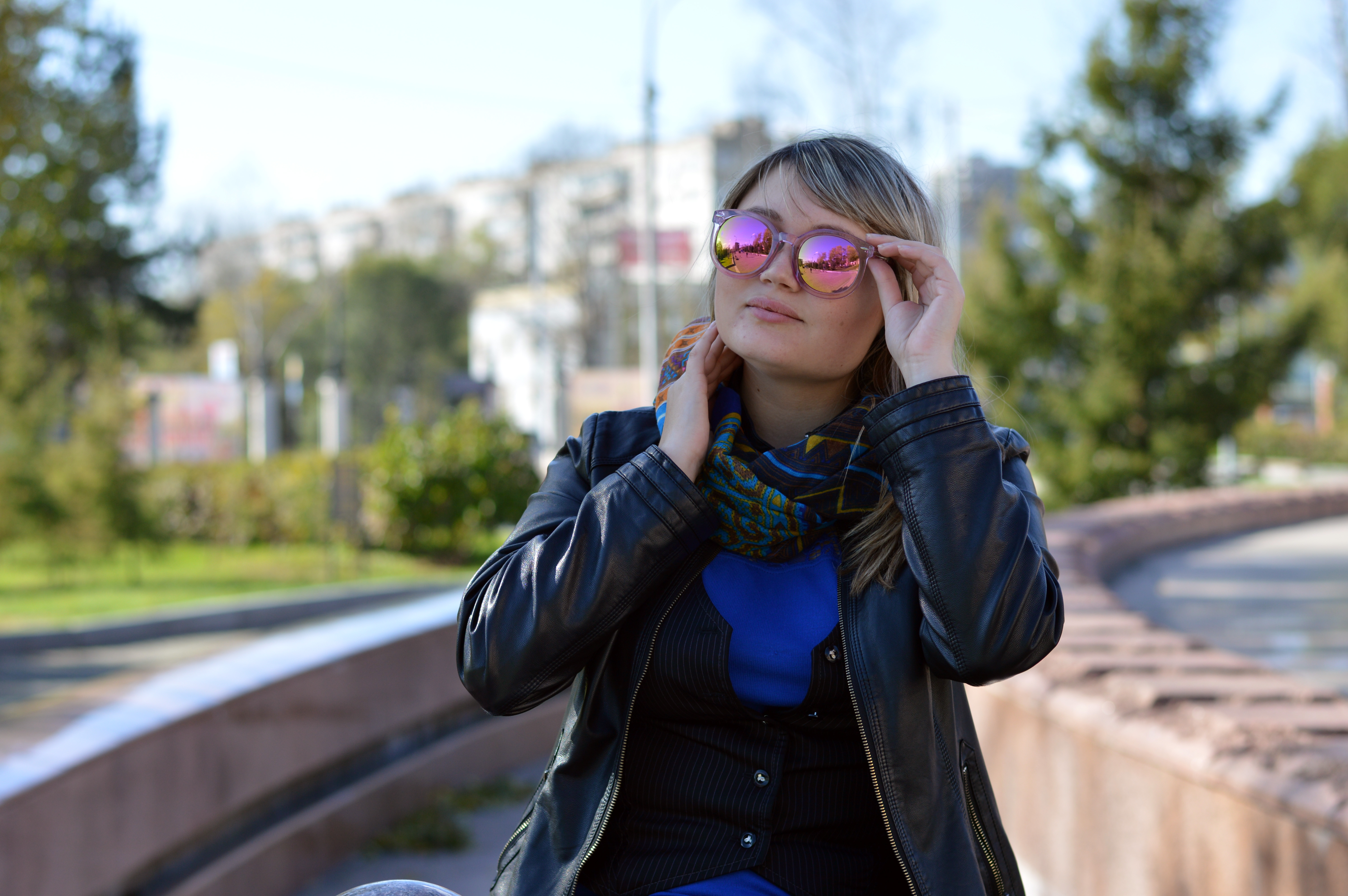 Теперь подобрана более лаконичная и динамичная поза модели, читается движение, а также эмоции, создаётся настроение. Фиолетовая тонировка очков модели создаёт дополнительный визуальный акцент на области её лица.