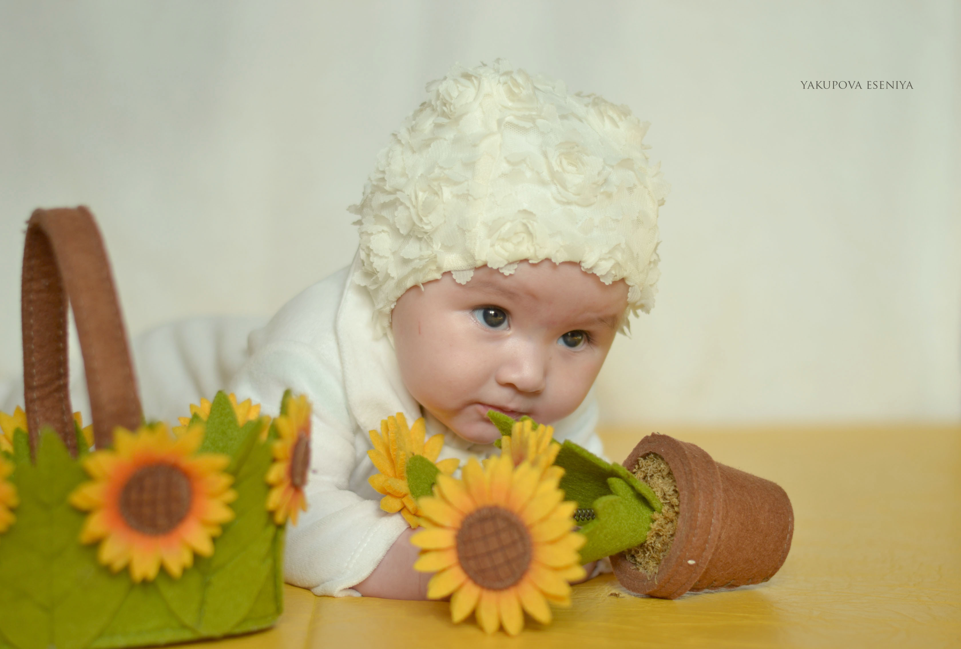 Правильно подобраны параметры экспозиции, диафрагма открыта и размытый фон усиливает на малышке внимание.