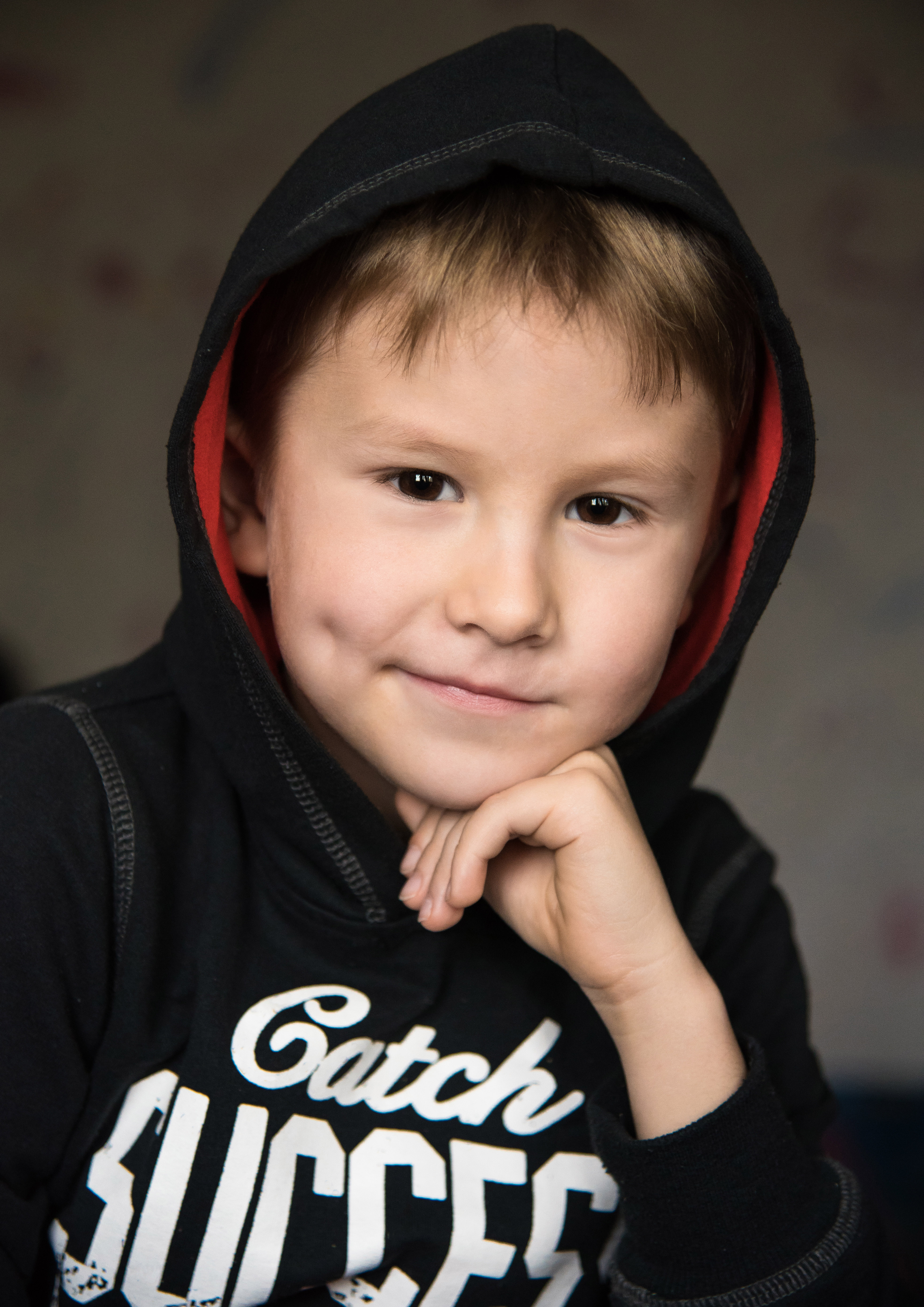 Фотография "Василий". Снято с фронтальным светом от окна. Был пасмурный день и пришлось поднять ISO 1400. Диафрагма f/4.5 для размытия фона. Решил одеть капюшон в качестве аксессуара. Мне кажется, улыбка, рука у подбородка и капюшон создают интересный образ ребёнка.