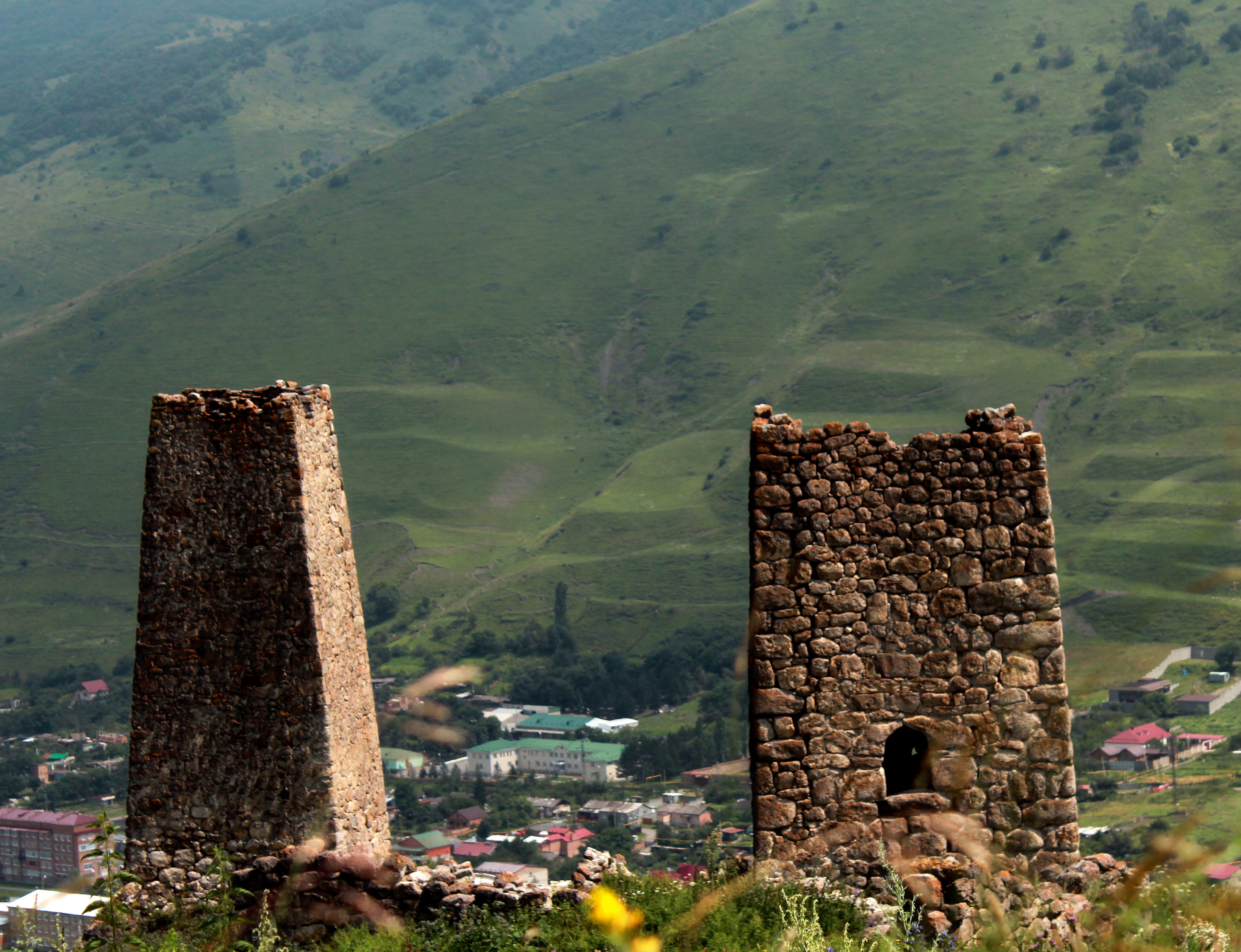 Две башни действительно создают удачный визуальный контраст по сюжету, атмосфере, внешнему виду и отношению пропорций с домиками на дальнем плане. В частности удачный высокий ракурс съёмки позволил прекрасно передать ощущение пространства, перспективы и масштаба. Здорово смотрится сочетание башен с зелёными холмами.