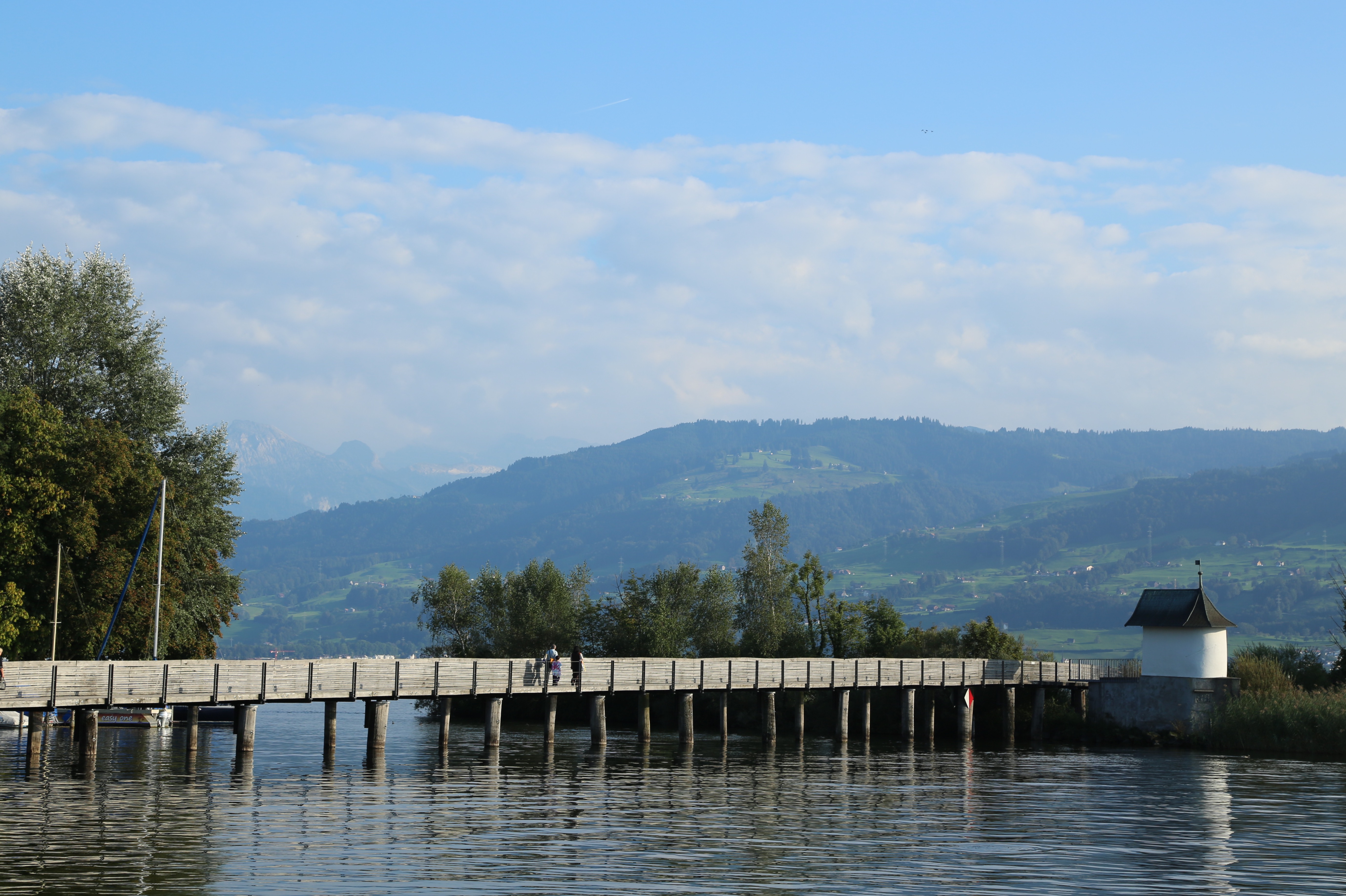 Линия мостика замечательно проводит взгляд зрителя по полю кадра. А благодаря эффекту атмосферной перспективы, горы на дальнем плане смотрятся более объёмными.