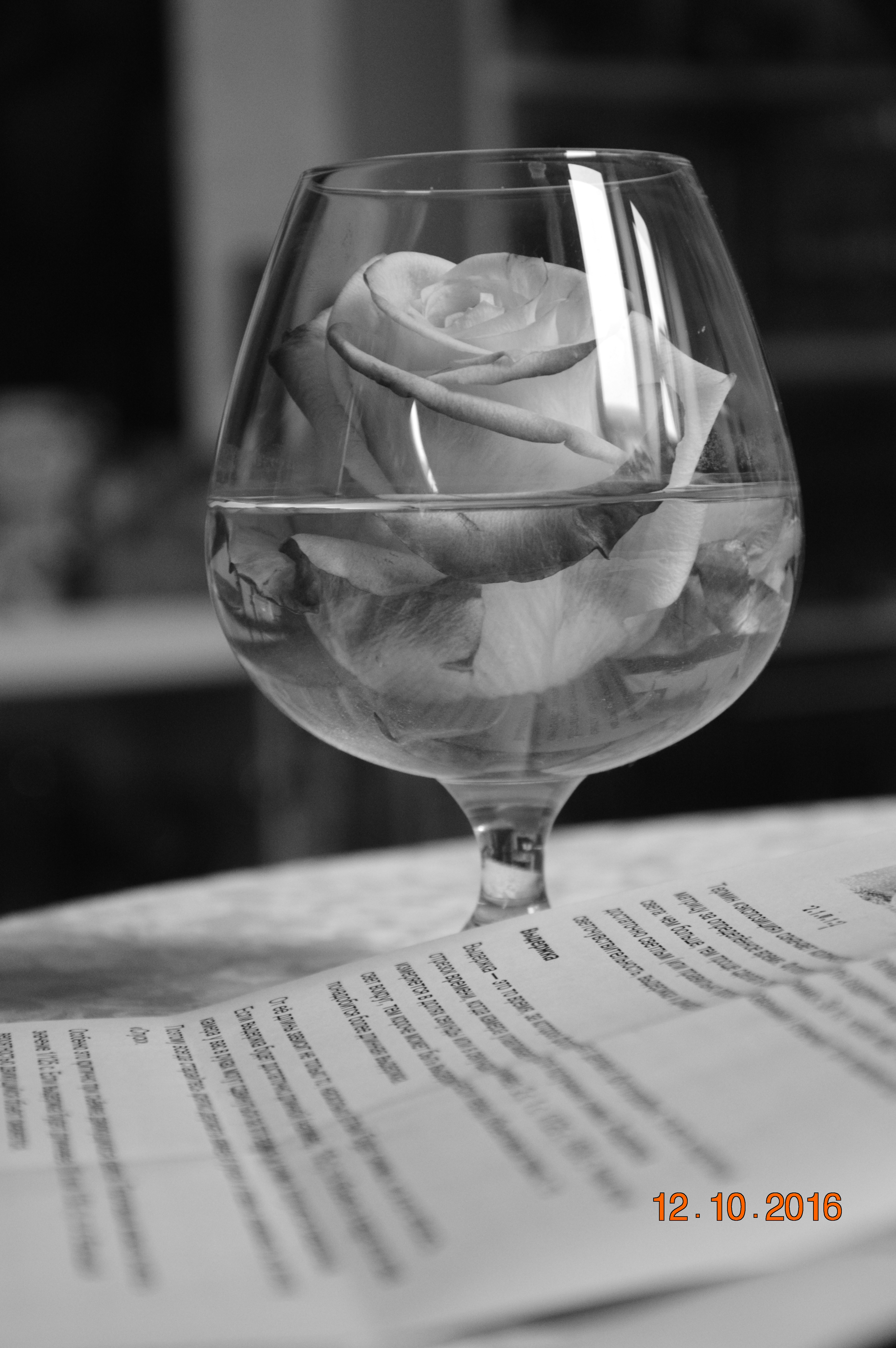 Красивый снимок. ЧБ тонирование позволило усилить акцент на формах, отбросив цветовые акценты. Вертикальная ориентация кадра позволила показать объект съёмки достаочно близко и не зажать границами кадра. Снимали в продвинутом режиме приоритета диафрагмы, что позволило выделить фужер в кадре резкостью, а фон красиво увести в нерезкость, добившись малой глубины резкости.