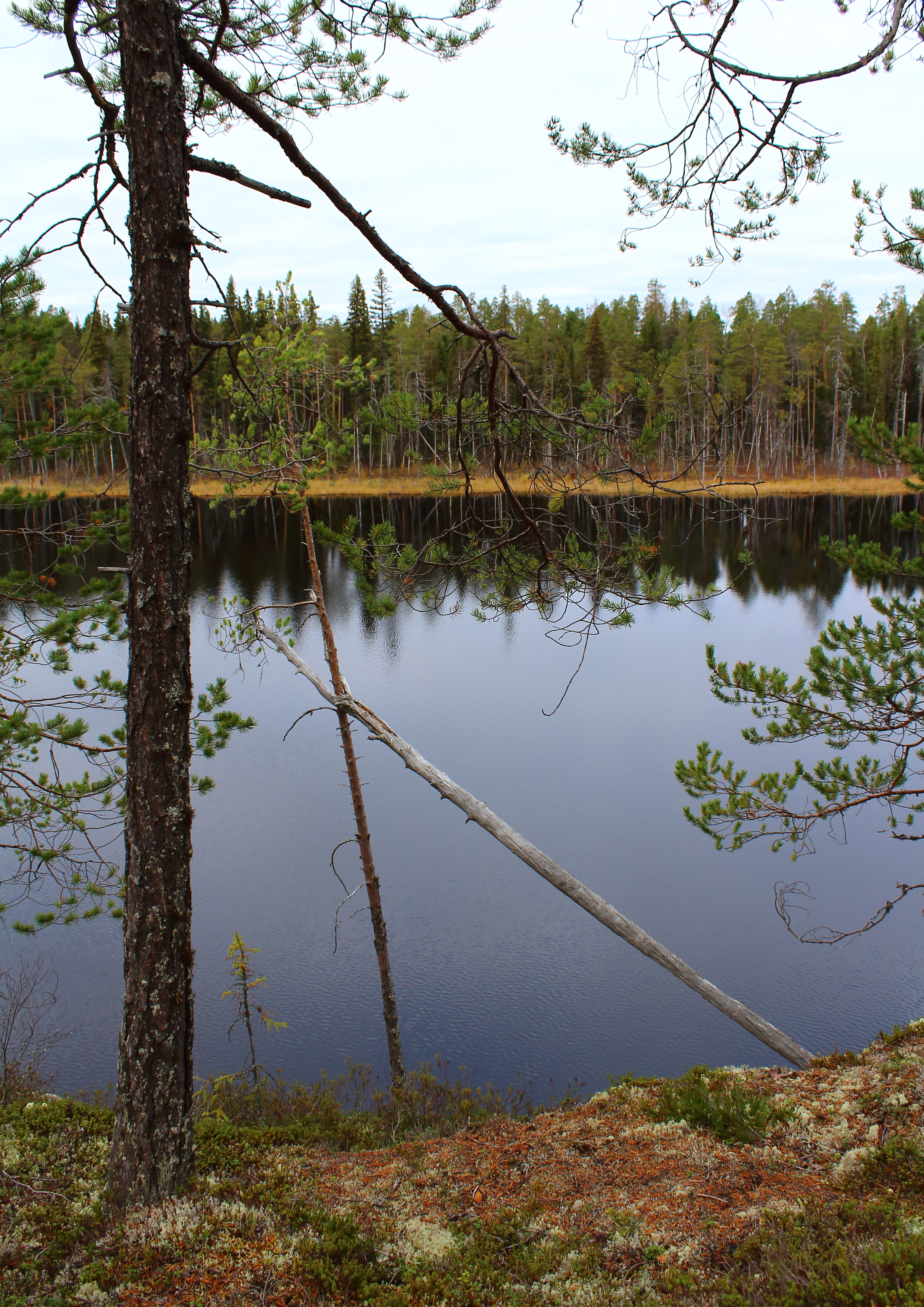 На фотографии изображен пейзаж на берегу озера. Край берега обрывается и дальше мы видим озеро. Между землей и озером есть два молоденьких дерева, одно из которых повалилось и вместе с линией земли эти деревья образуют треугольник. Фотография светлая, яркая, контрастная, нейтральная по настроению. Сложно определить, что на этом фото главнее, природа образует единую картинку, только, пожалуй, фигура из деревьев выходит на первый план.