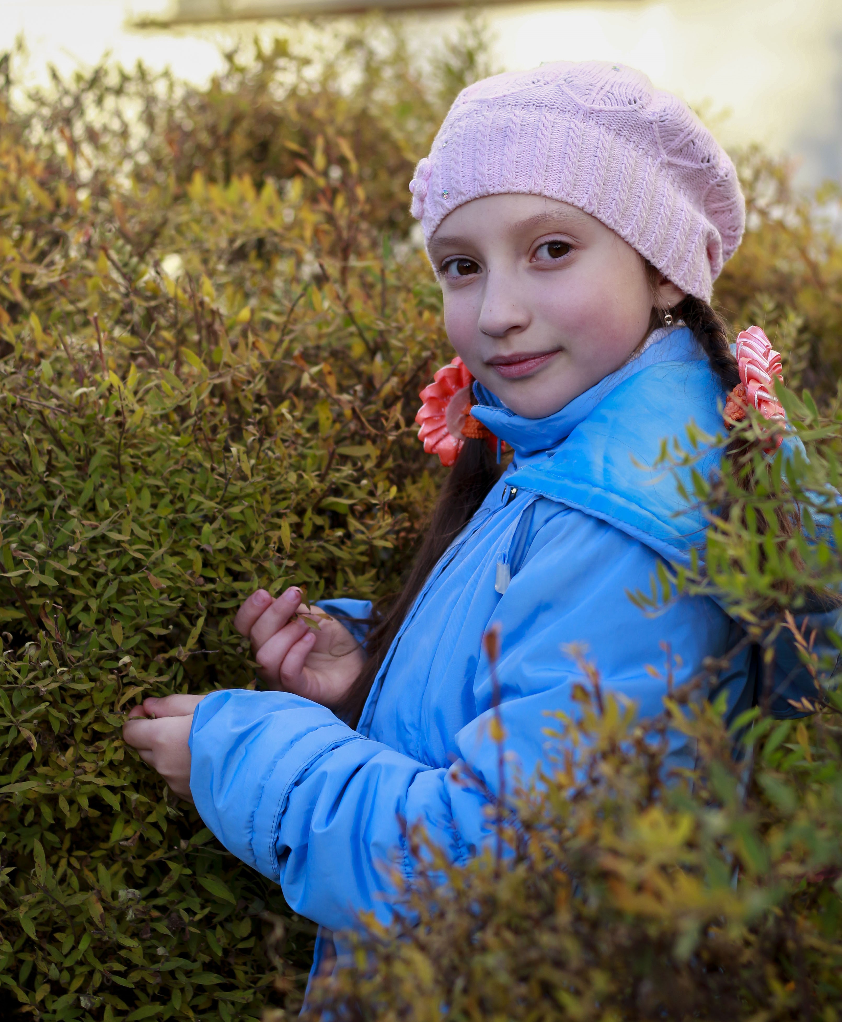 Выбранная диафрагма позволила мягко отделить модель от фона. Нет цифрового шума, т.к. значение ISO достаточно низкое. Ветки на переднем плане придают объема, глубины, дают эффект присутствия. Трогательно смотрятся ручки. Они придают образу целостность, завершенность.