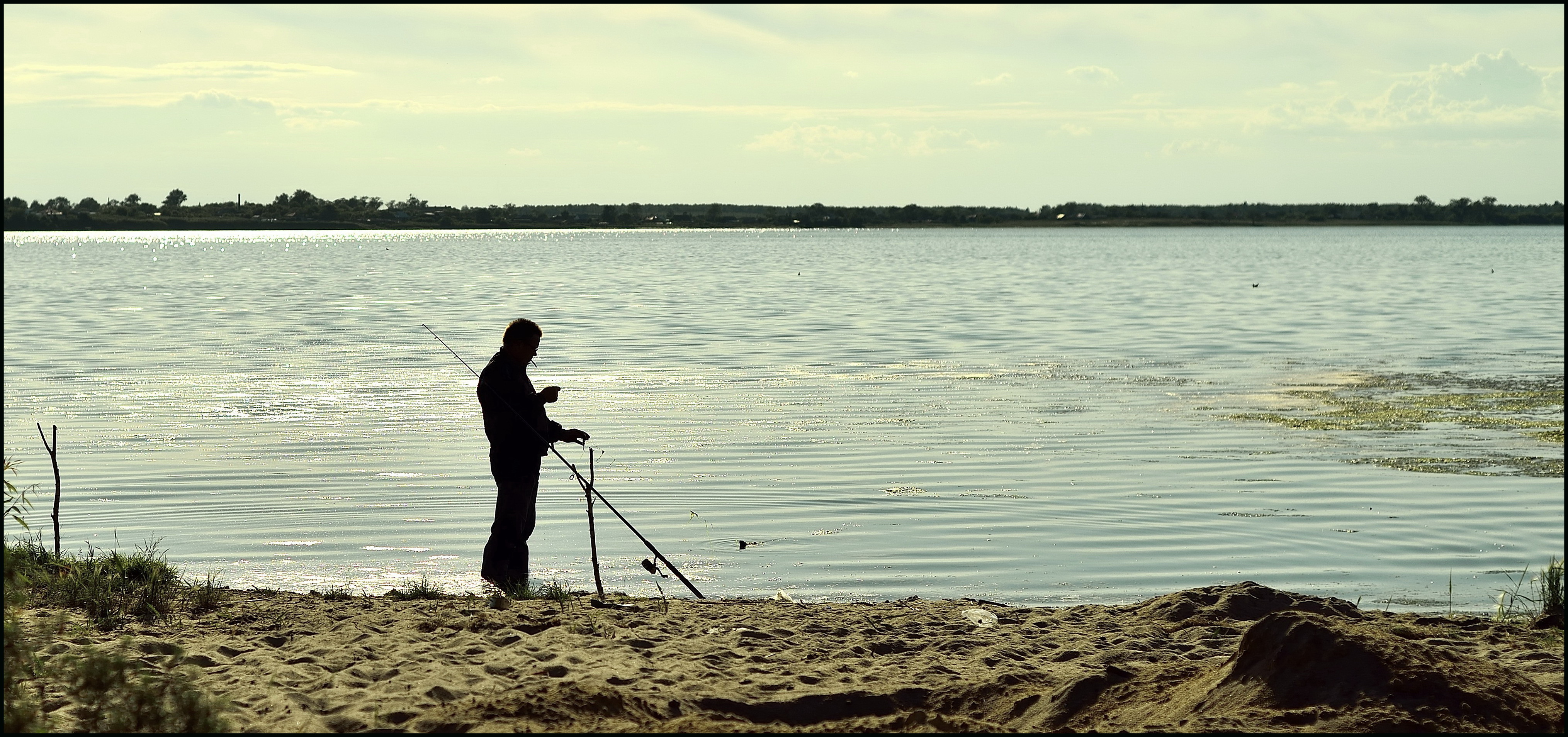 С верней точки съемки рыбак выглядит уменьшенным. На фоне воды силуэт становится особенно выразительным.
