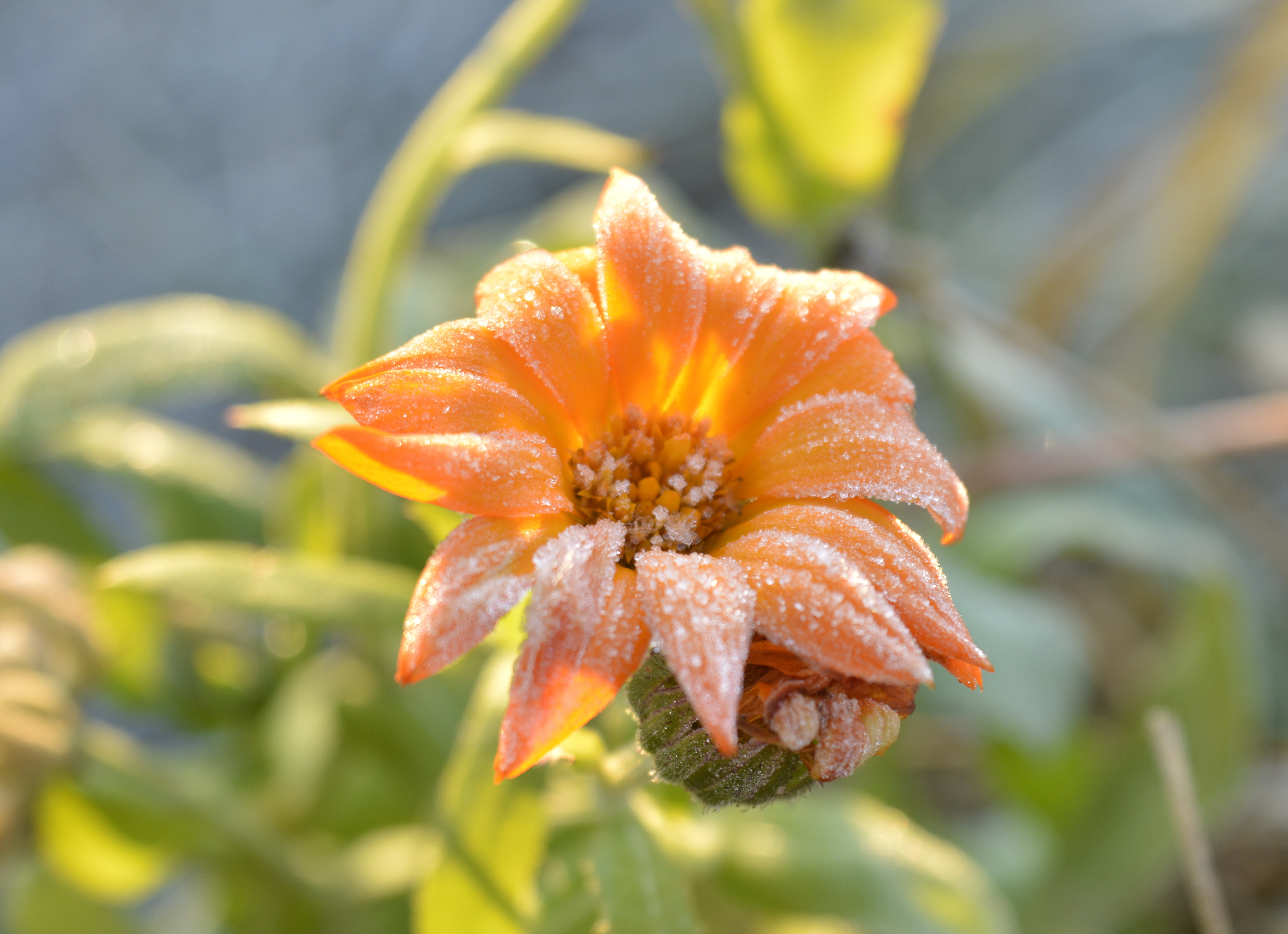 Красивое сочетание. Капельки изморози сверкают словно украшение цветка, добавляют его лепесткам блеск.