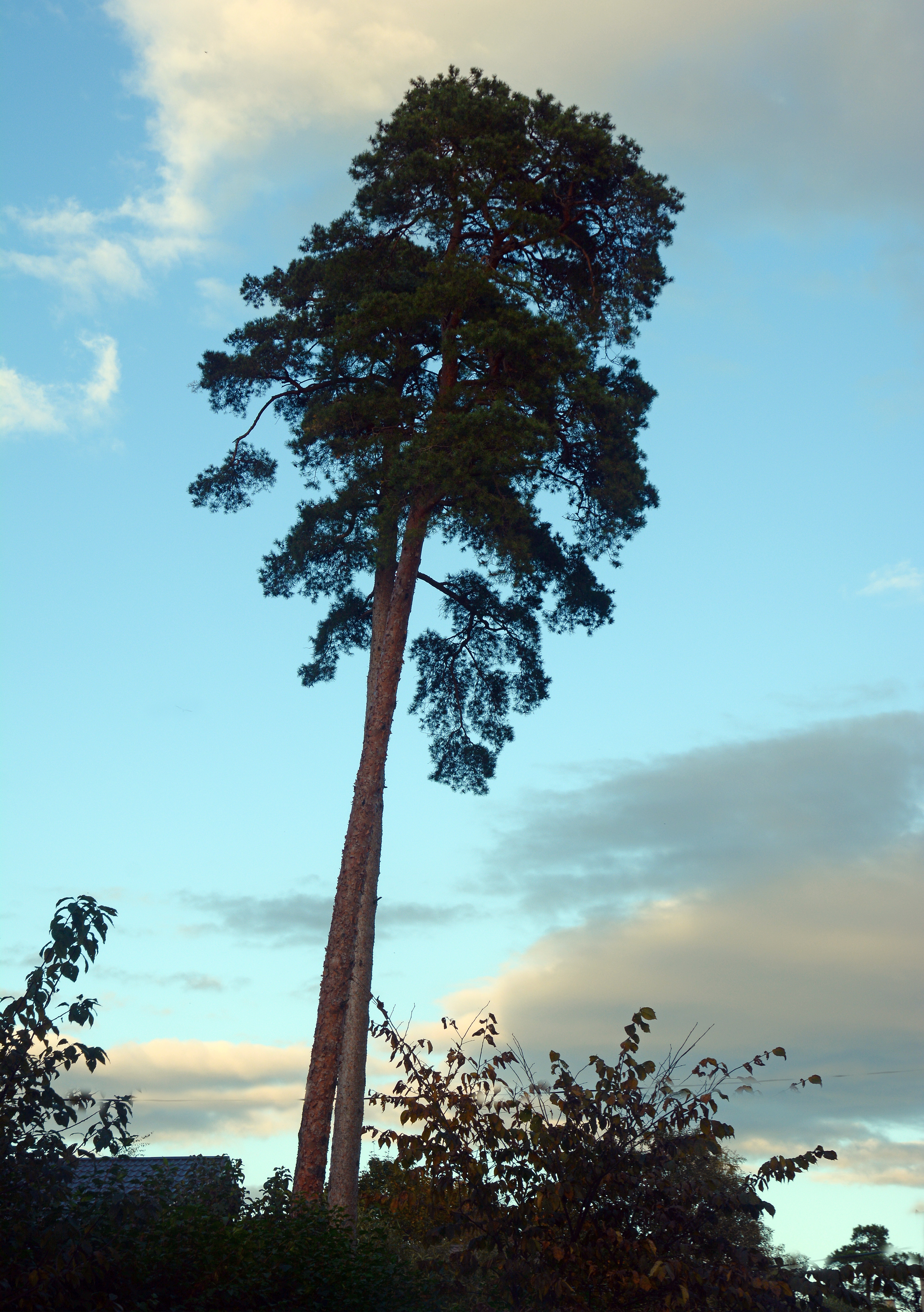 Несмотря на силуэтный характер снимка все формы в нем узнаваемые - крыша дома, пересекающиеся стволы двух сосен, растительность внизу. Сочетание форм не нарушило целостность общего восприятия.