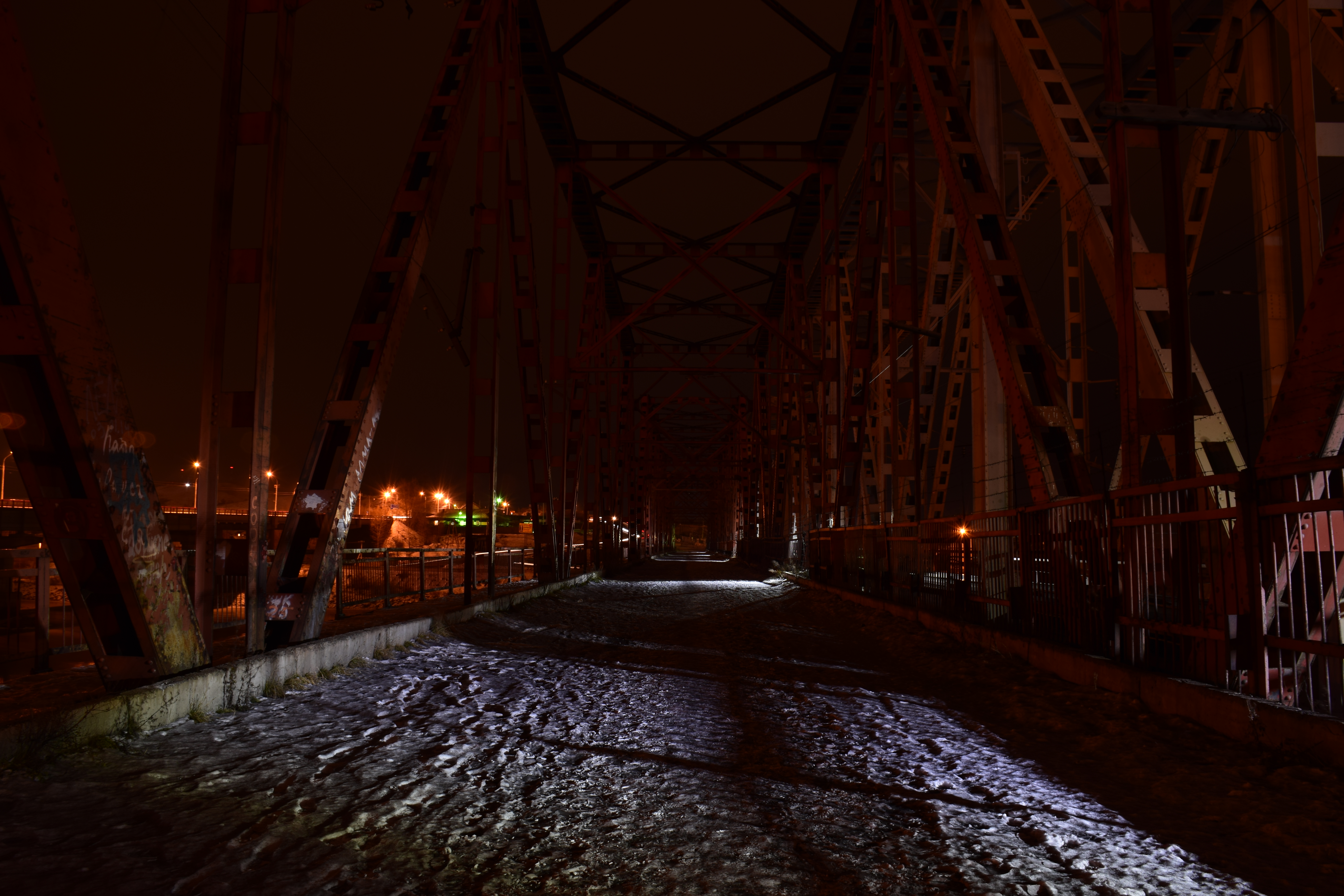 Снимок сделан холодной сибирской ночью, на старом ж/д мосту. В режиме М, со штатива, с задержкой спуска. При диафрагме 9 и выдержке 30с. С такими параметрами получалось наиболее атмосферное освещение, даже при диафрагме 11 эффект уже был слабее. Автоматика подбирала баланс белого, вроде справилась неплохо.