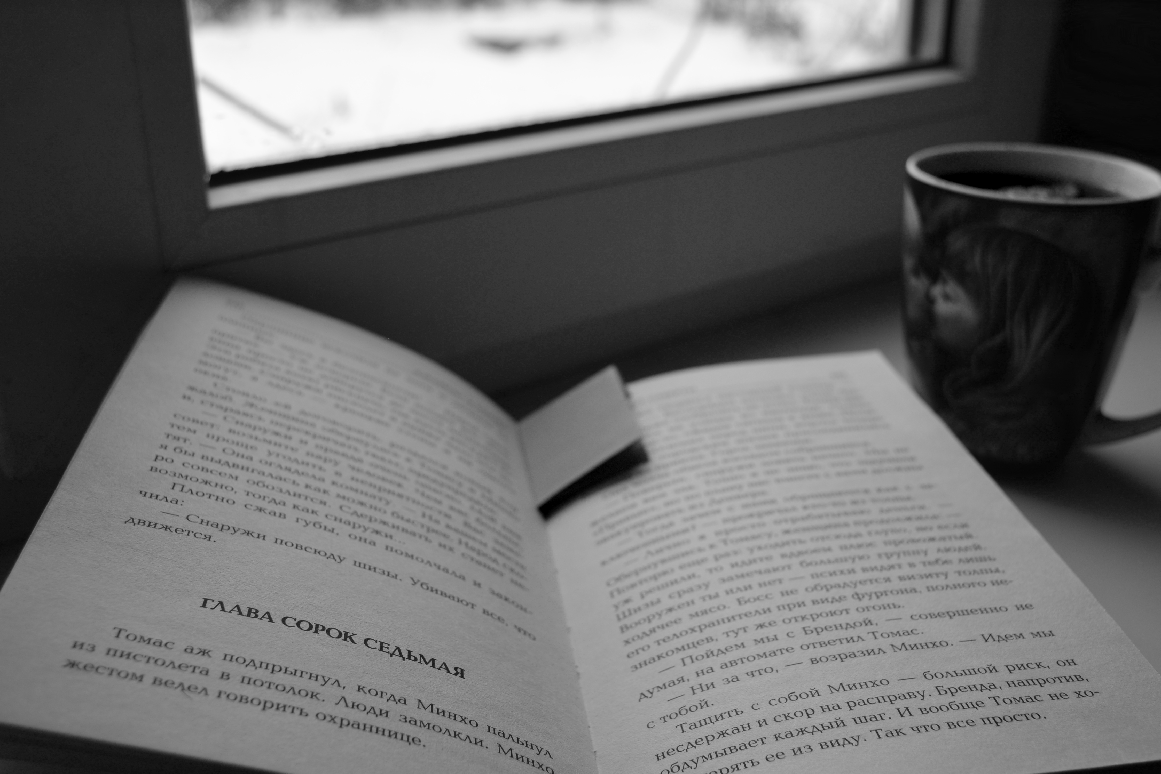 Хорошо сняли! Правильно использовали свет из окна, как и само окно - очень гармонично вписалось в сюжет снимка. Освещение мягкое, светотеневой рисунок размытый, без резких теней и засветок, с плавными полутенями. Выгодно сказался перевод в ЧБ - кофе в чашке немного отвлекает в цвете. Закладку убирать не нужно, она играет важную роль, работает на сюжет.