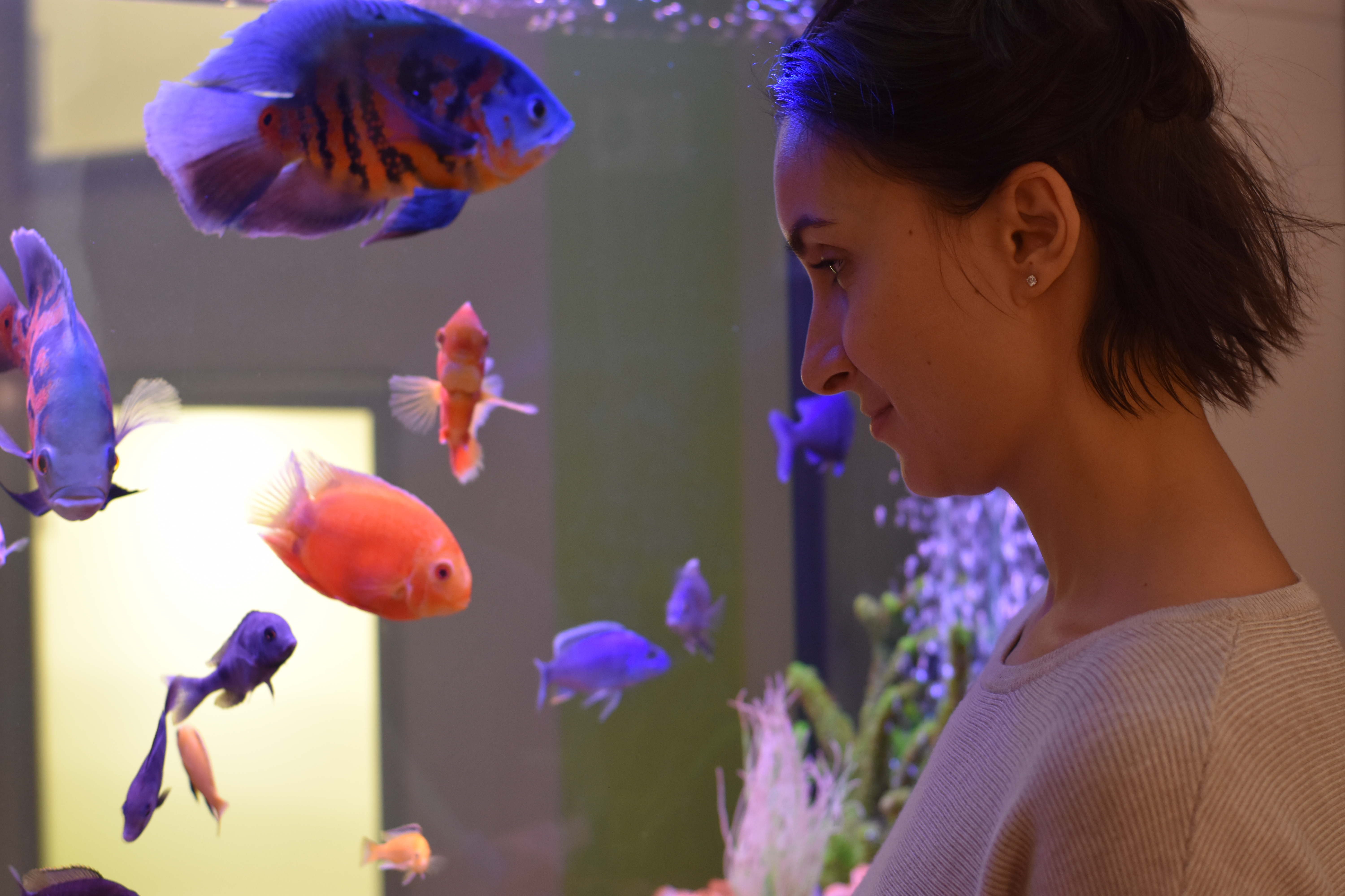 Очень интересный снимок у Вас получился! Складывается ощущение, что модель находится под водой! Цвета на снимке получились яркими и естественными. Экспозиция подобрана верно, приглушённые тона симка подчёркивают атмосферу локации. Замечаний к выбору настроек нет. Выдержка выбрана верно, недостаток освещения скомпенсирован светочувствительностью и вспышкой, которая аккуратно подсветила тени.