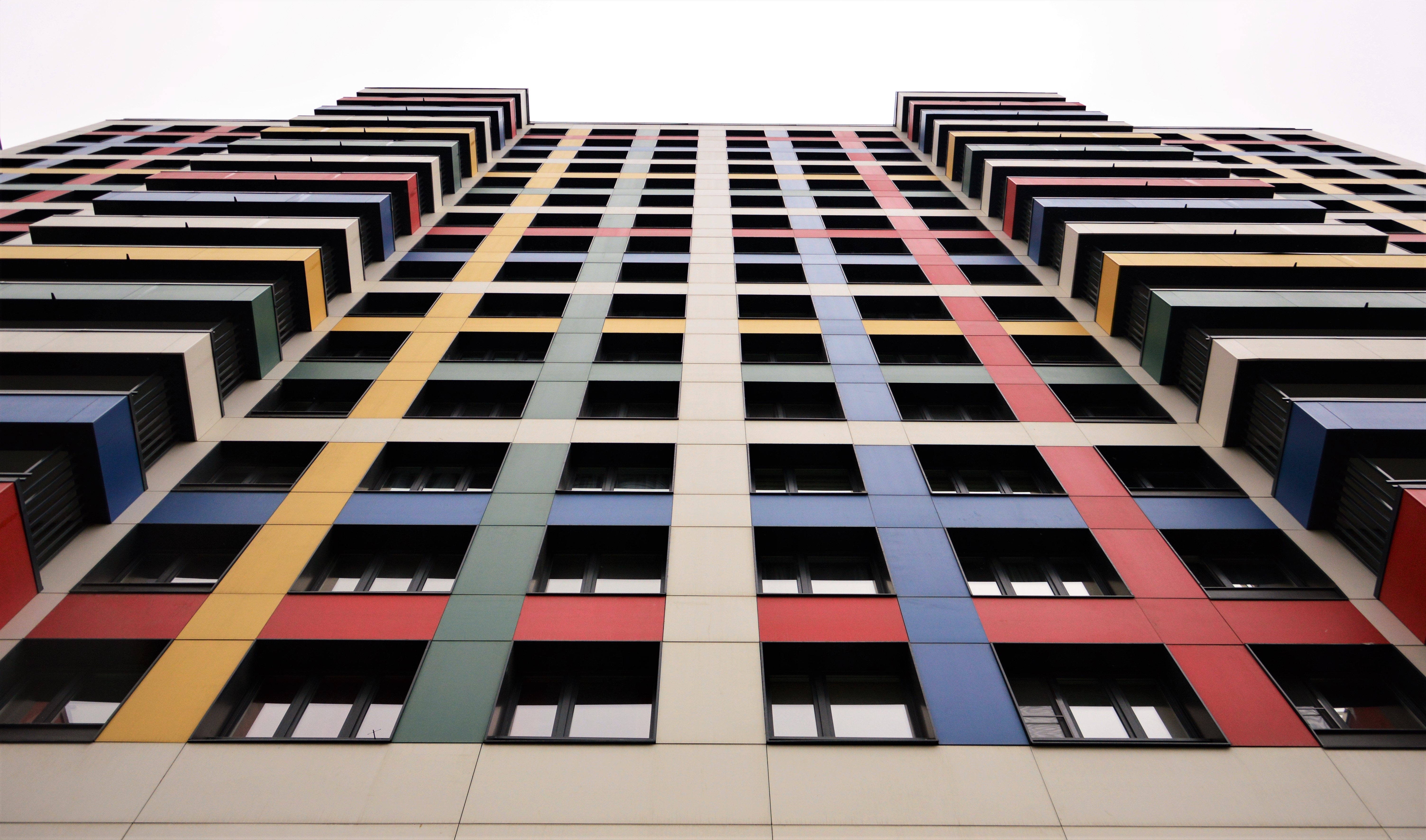 Окна образуют хороший визуальный узор за счёт подобия форм, а цветовые линии обогащают общую композицию привлекая внимание зрителя.