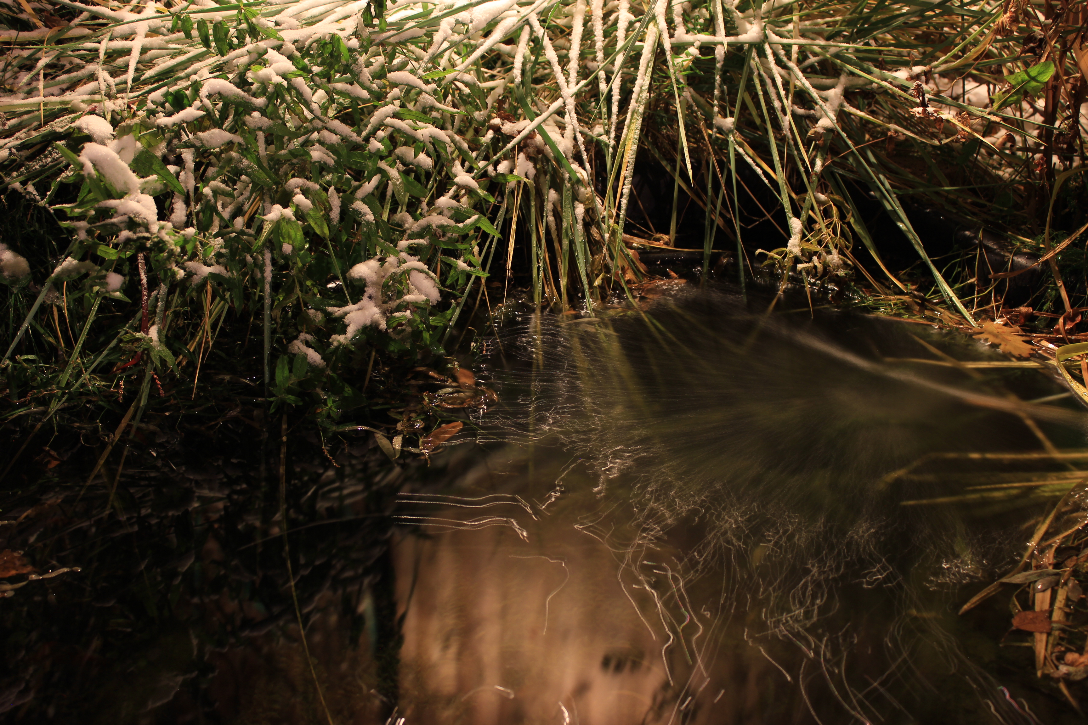 При съёмке с длинной выдержкой - главное "закрепить" крепко камеру и это вам отлично удалось. Несмотря на длинную выдержку, удалось избежать смаза что говорит о съёмке со штатива или с опоры. Исо верно выставили минимальным, так что качество на высоте. Здорово смотрятся следы на льду или воде, так сразу не понять. А заснеженные растения выступают в качестве естественной рамки, красиво обрамляя сюжет.