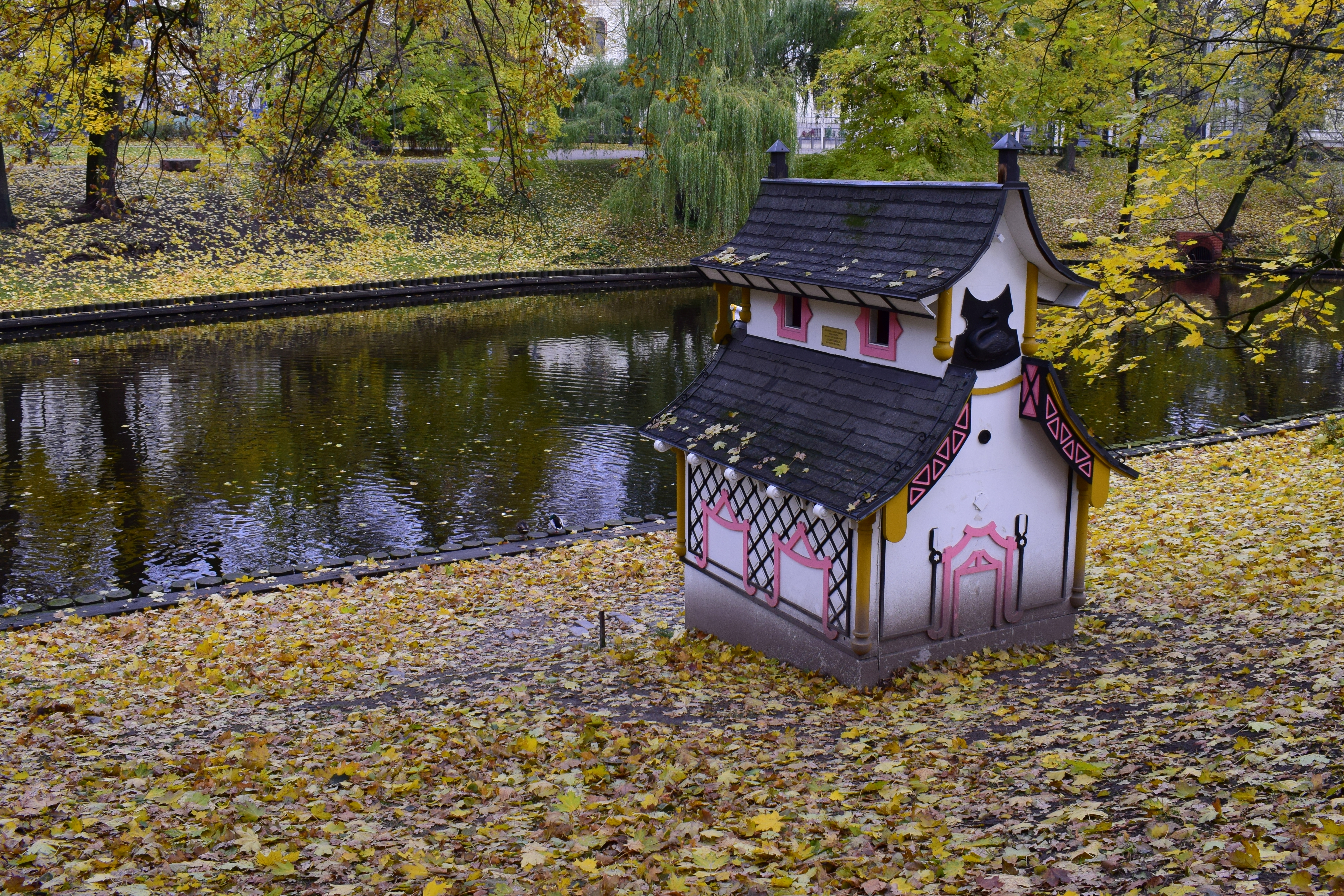 Мини-домик в осеннем парке в пасмурную погоду. Съёмка с рук, режим приоритета диафрагмы.