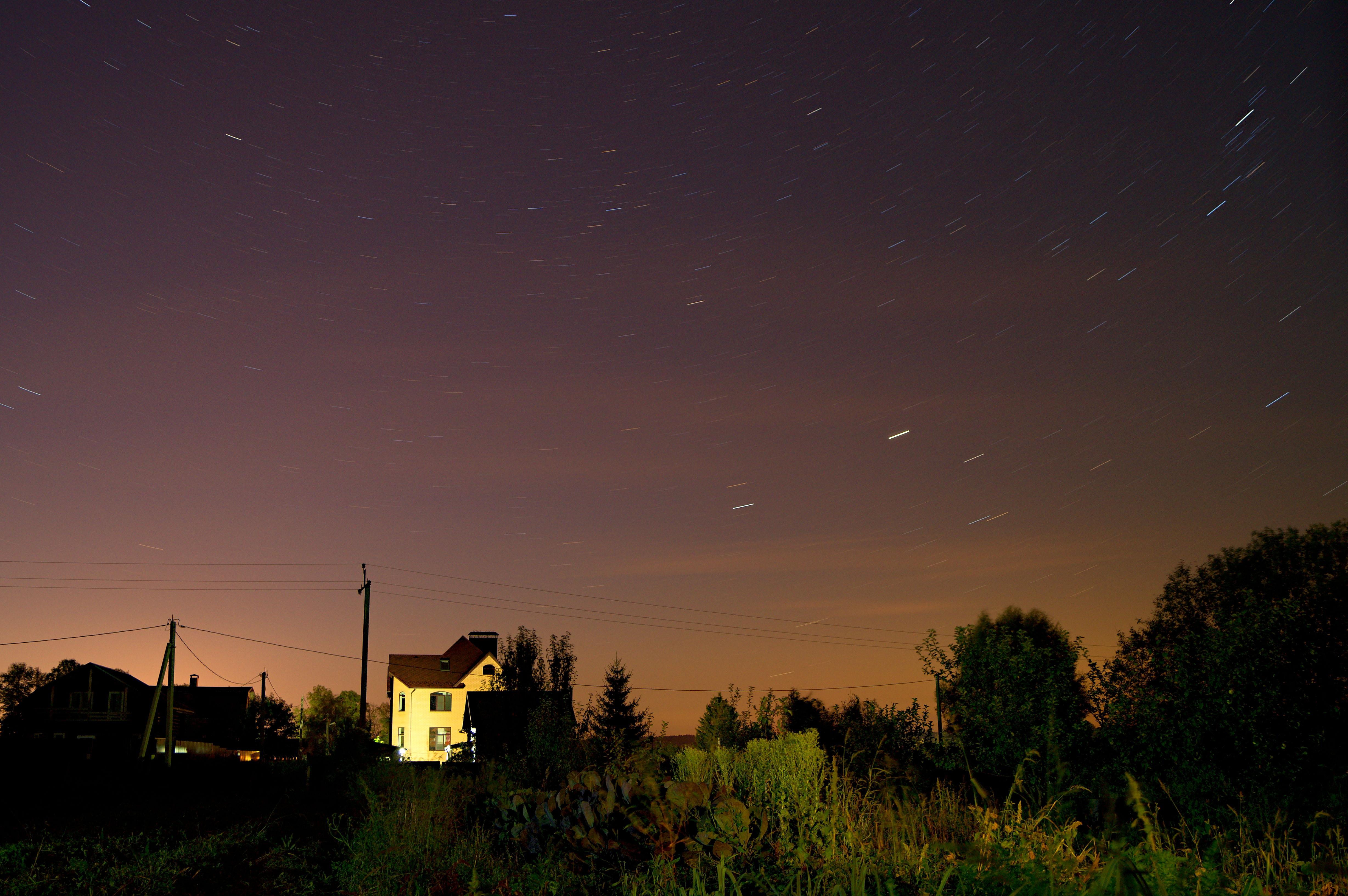 Удачно подсветили кустики на переднем плане, здание жёлтого тона на среднем плане играет роль визуального центра кадра за счёт доминирующей яркости, звёздное небо заполняет дальний план.