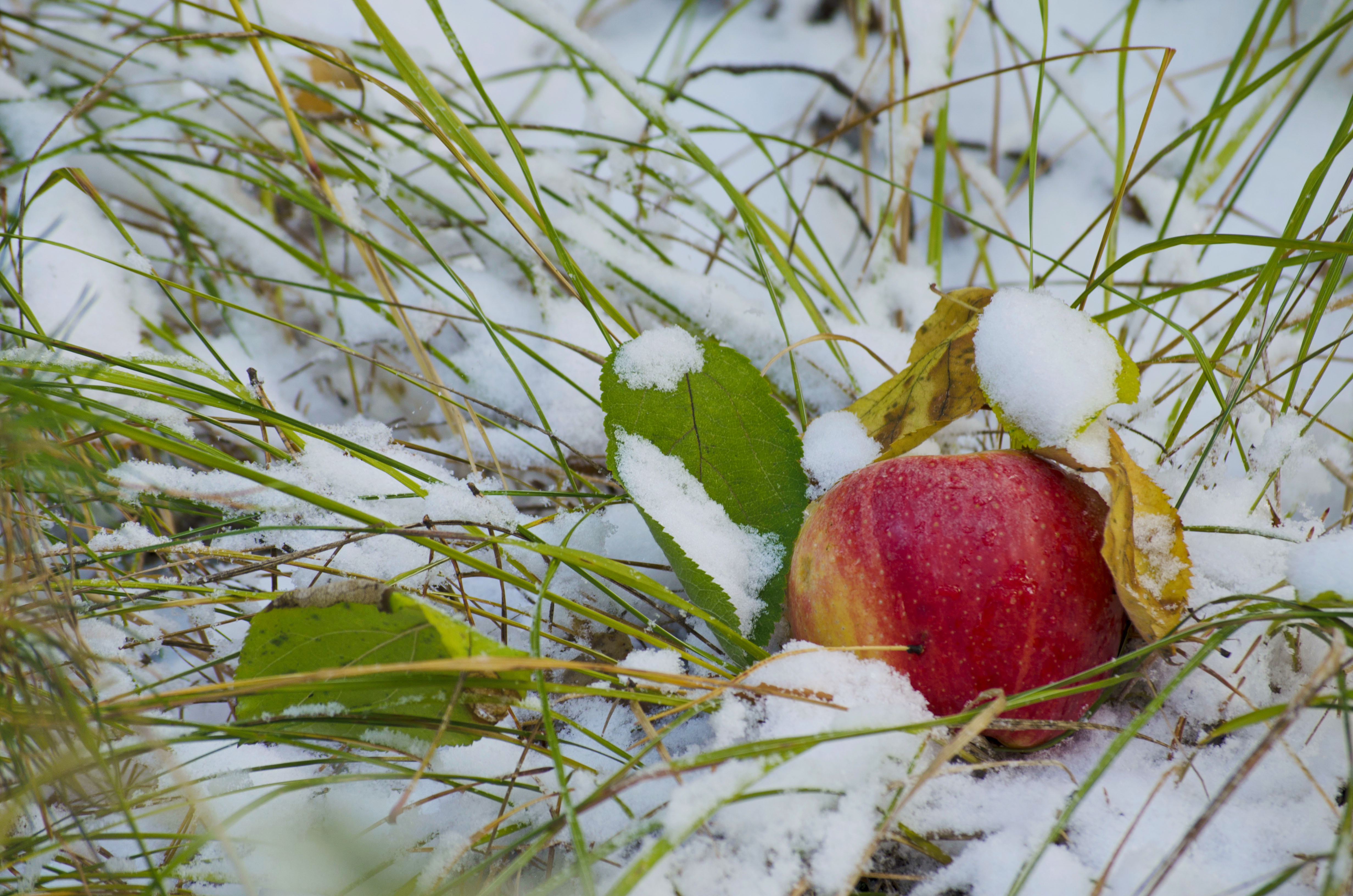 Длинные зелёные травинки и листики присыпанные снегом образуют удачное визуальное обрамление для яблока, дополняя цветовую гамму.