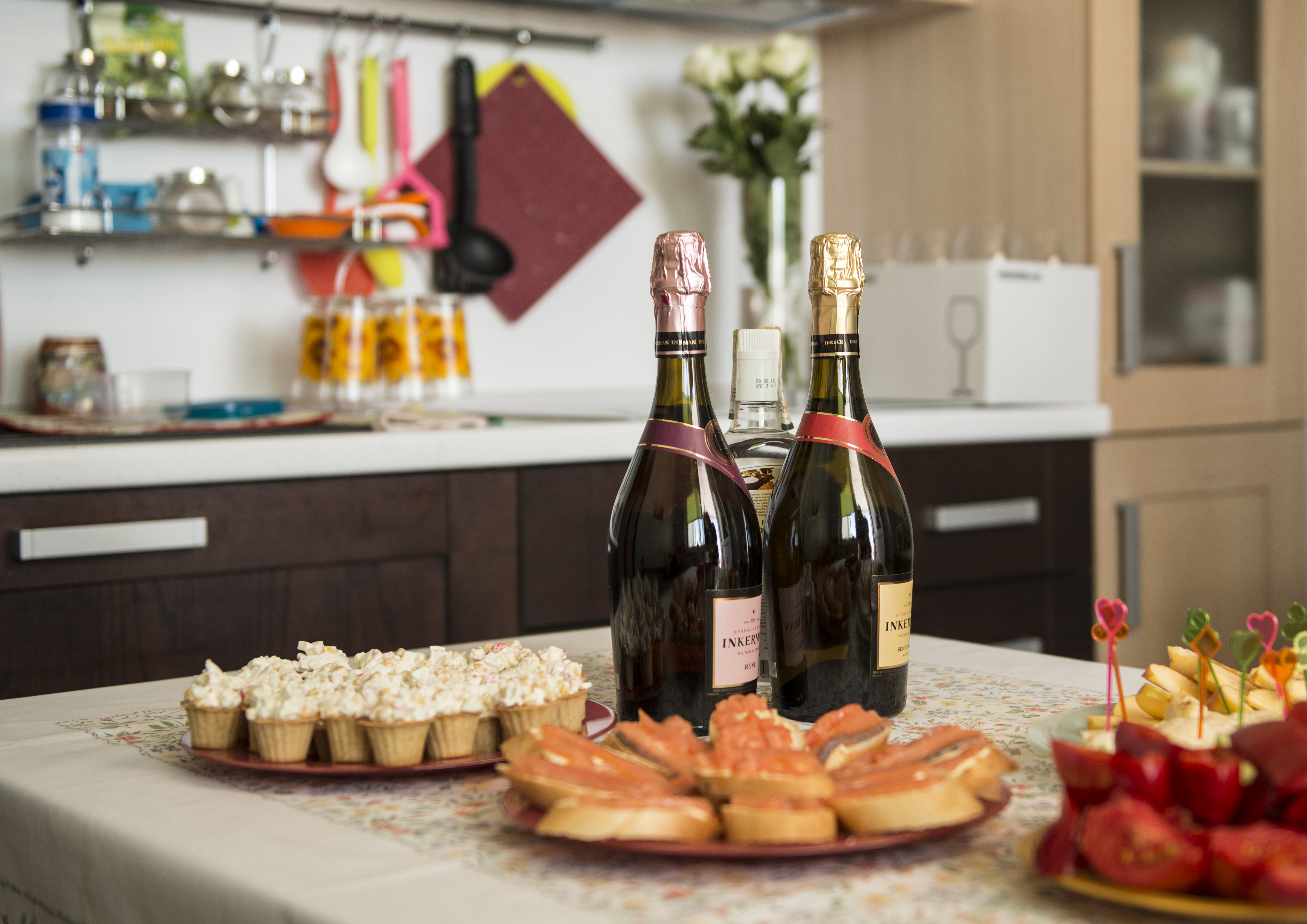 Не совсем удачно, что в фокусе только бутылки, а закуски в резкость не попали.