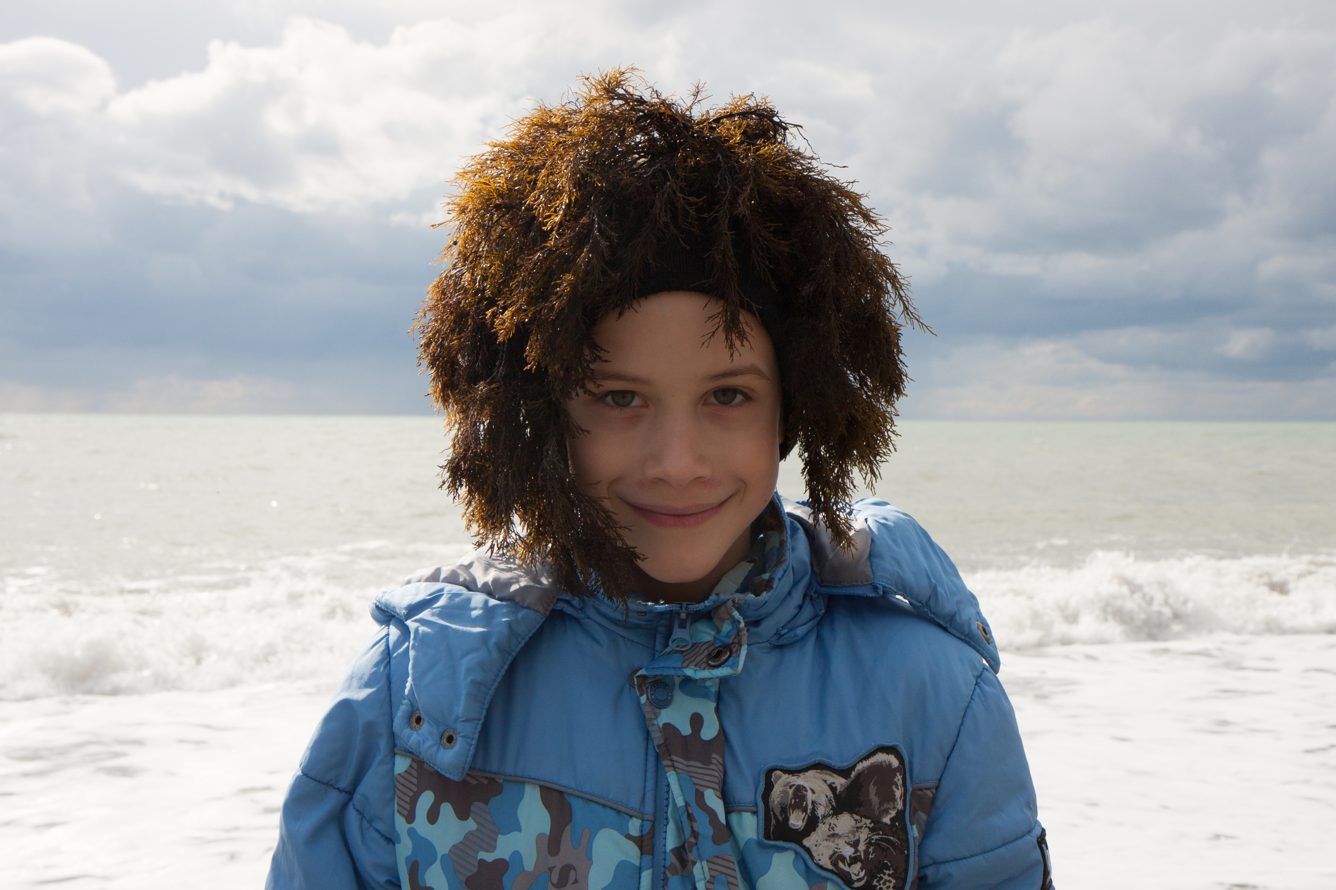 Добрый день! мальчишка на берегу нашел водоросли и я ему предложила одеть их как парик и сделать из него морское чудище.. чудище не получилось, остался очень милым ребенком))