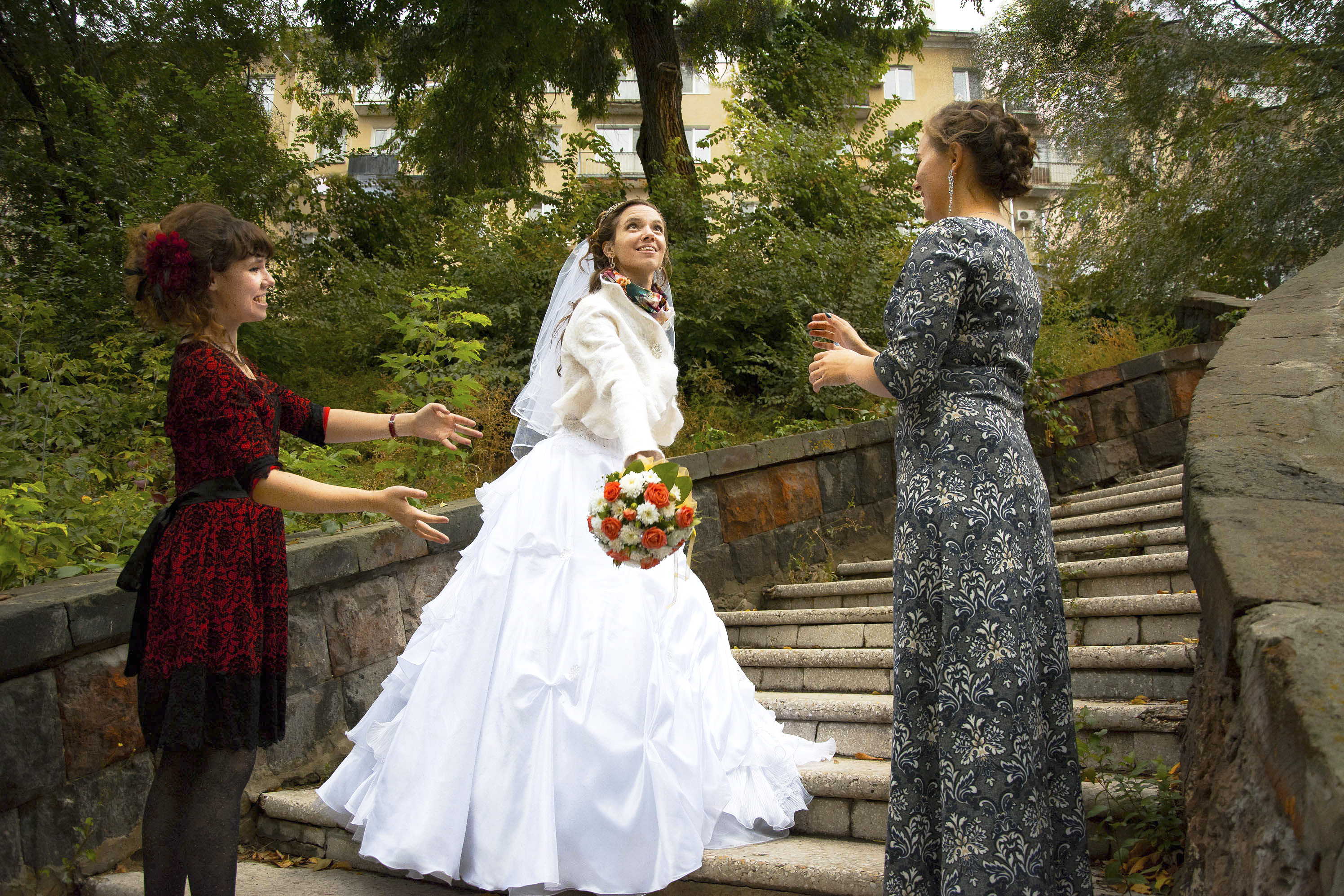 Отличный снимок у Вас получился! Момент пойман очень удачно- замечательно видны искренние эмоции подружек невесты! Нижний ракурс съемки чудесно передал динамику и выделил невесту, красиво показав платье. Короткая выдержка позволила зафиксировать движение, а недостаток освещения скомпенсирован светочувствительностью. Экспозиция выбрана верно. Цвета на снимке яркие и натуральные.