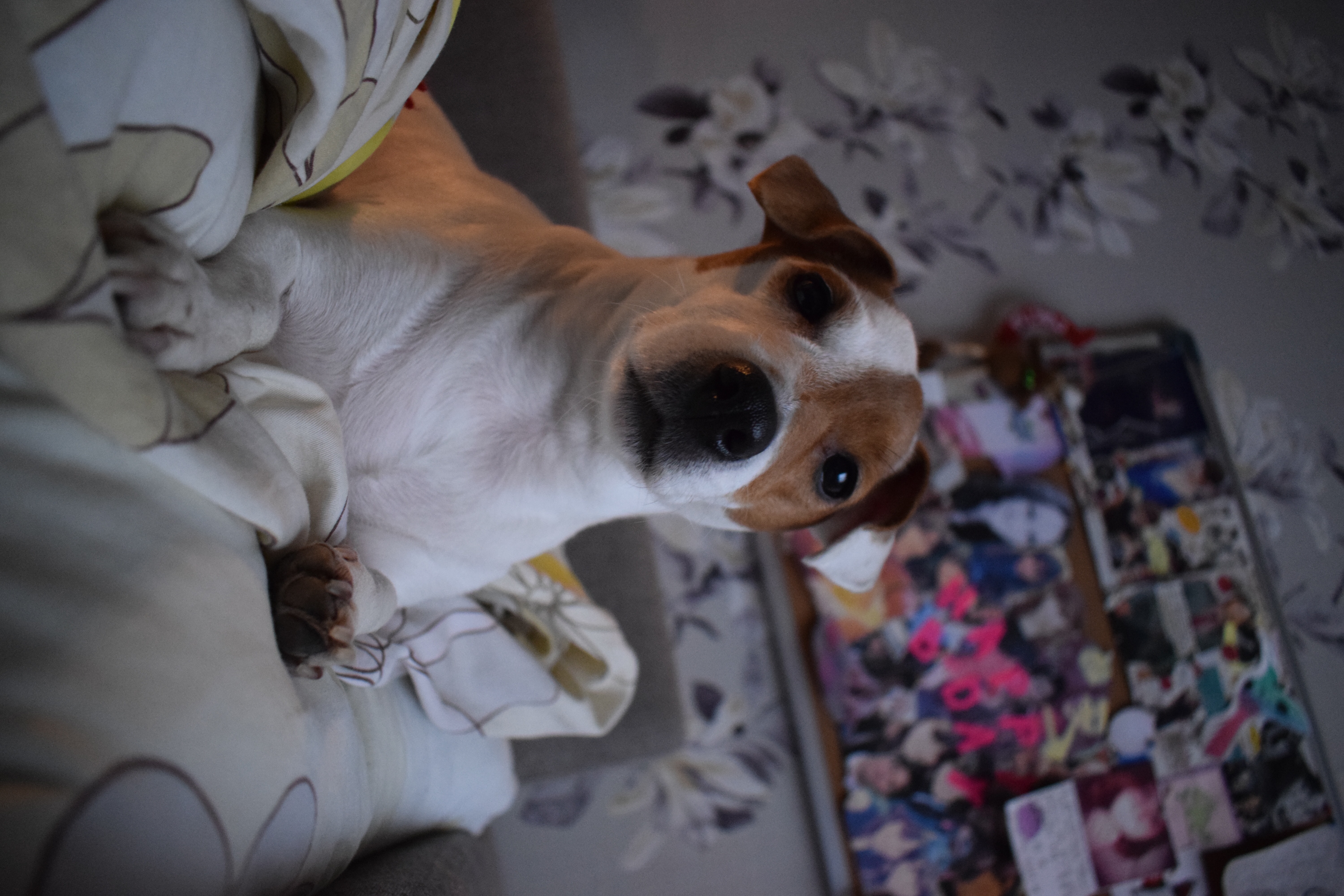 Хороший снимок! Точно сфокусировались на главном объекте, получилось размыть фон, что хорошо выделяет питомца на снимке. Цветопередача правильная, освещение мягкое. Очень хорошо, что ушли от центрального расположения главного объекта в кадре - захватили больше доски с фотографиями на заднем плане, удачно. Небольшой наклон снимка влево добавляет динамики.
