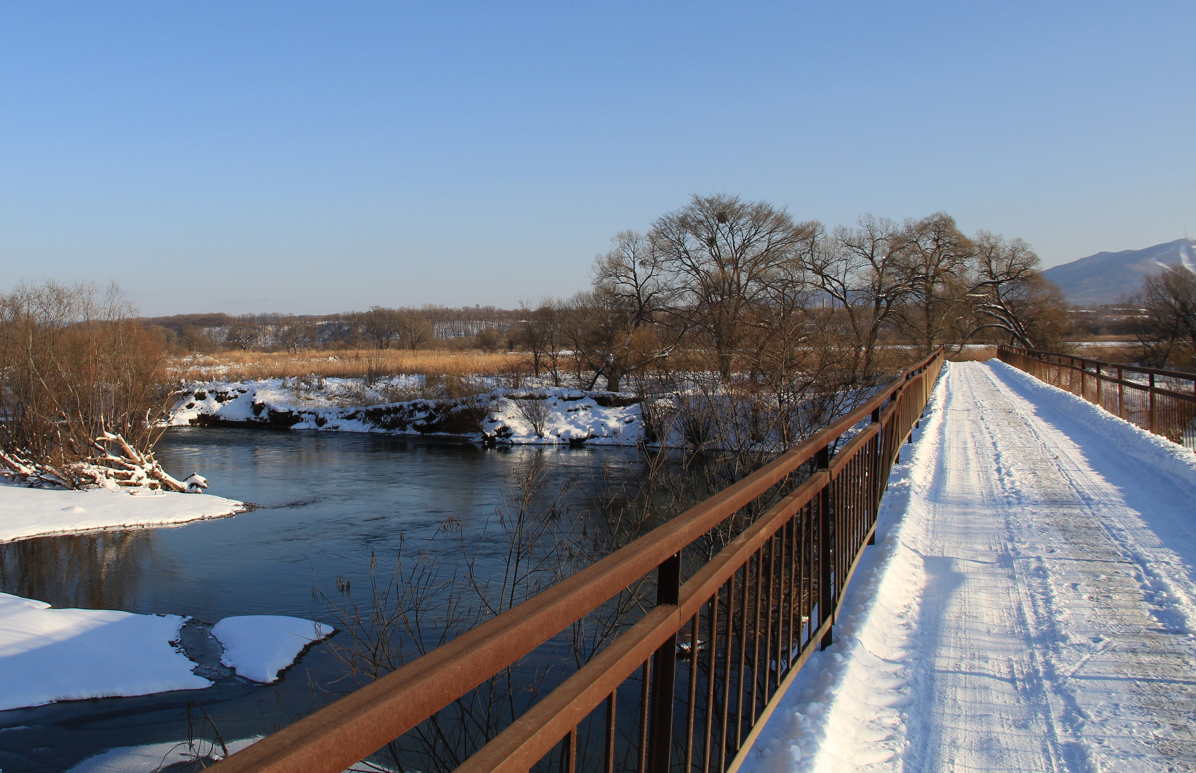 Хороший пейзажный вид. Вот бы еще сделать шаг назад и повести линию перил от самого угла кадра, а также, чуть больше пространства моста взять в кадр.