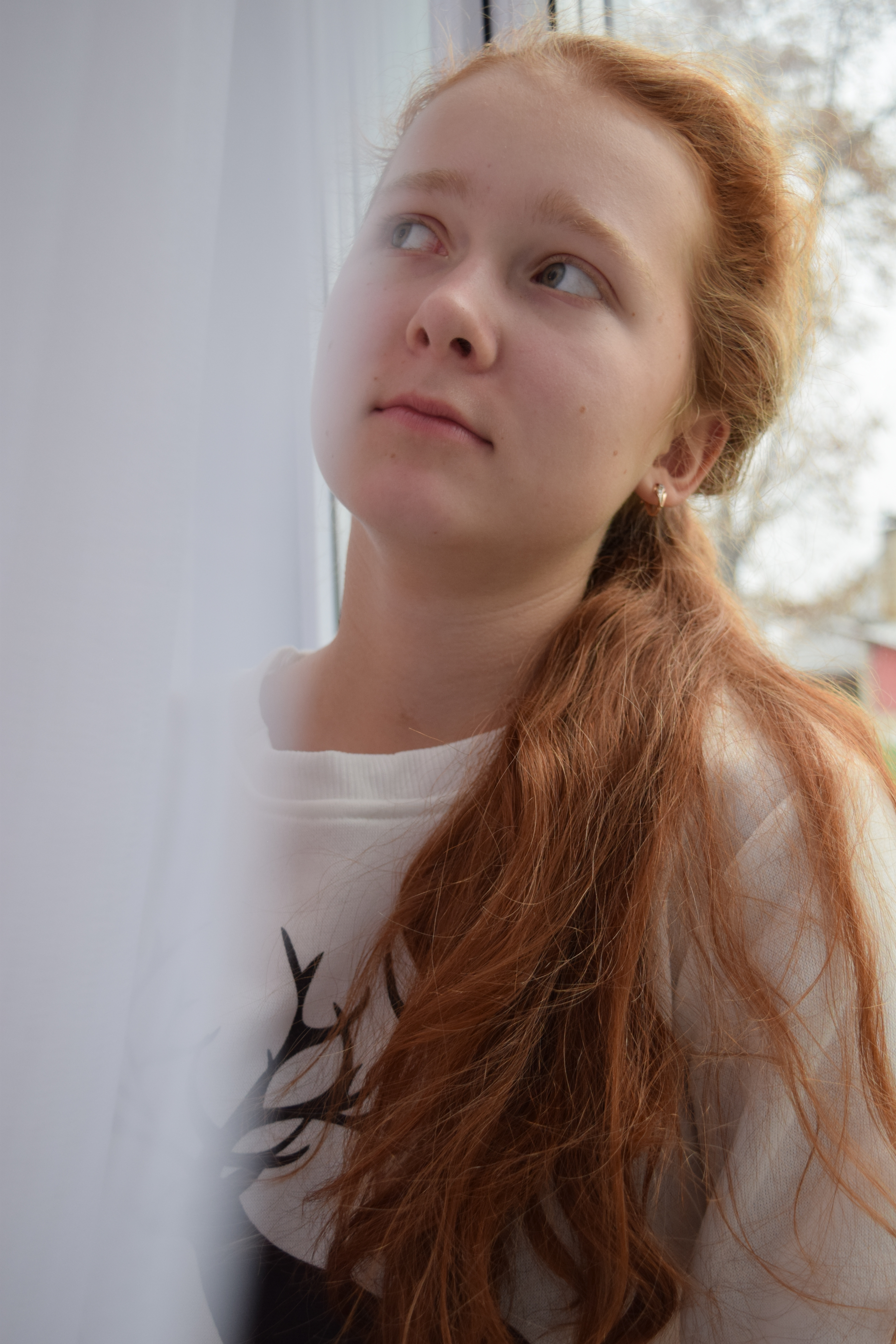 Фотография в жанре портрета. С достаточно равномерным освещением. И хотя характер света контровой, но занавеска на ближнем плане хорошо отражает свет и он компенсирует тени на лице модели.