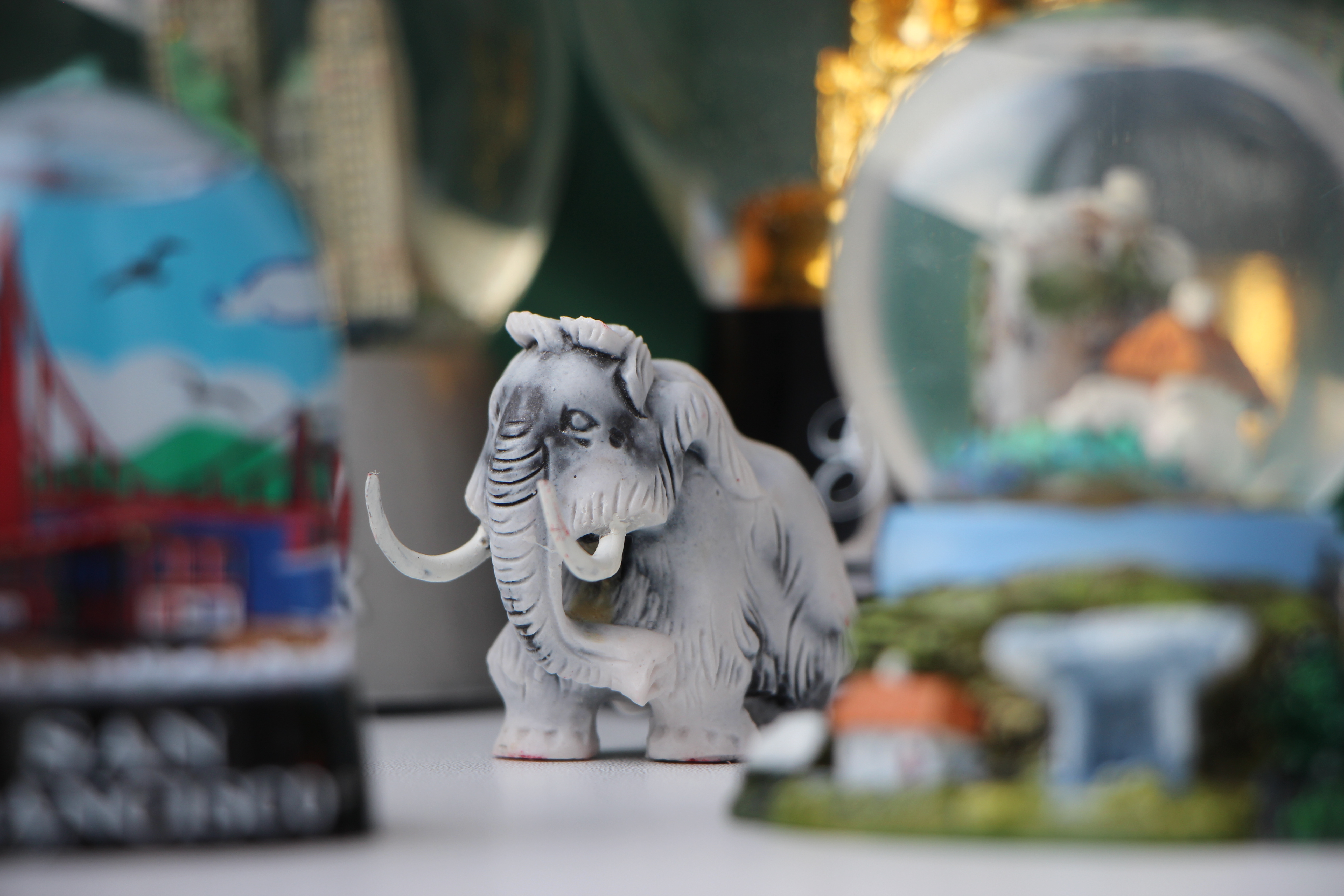 В переднем плане размещаются предметы, они не попали в поле резкости. Фигурка между этими предметами подчеркнута, как в рамочке. Зритель как будто подглядывает за мамонтом между другими предметами. Вот вот и фигурка оживет :)