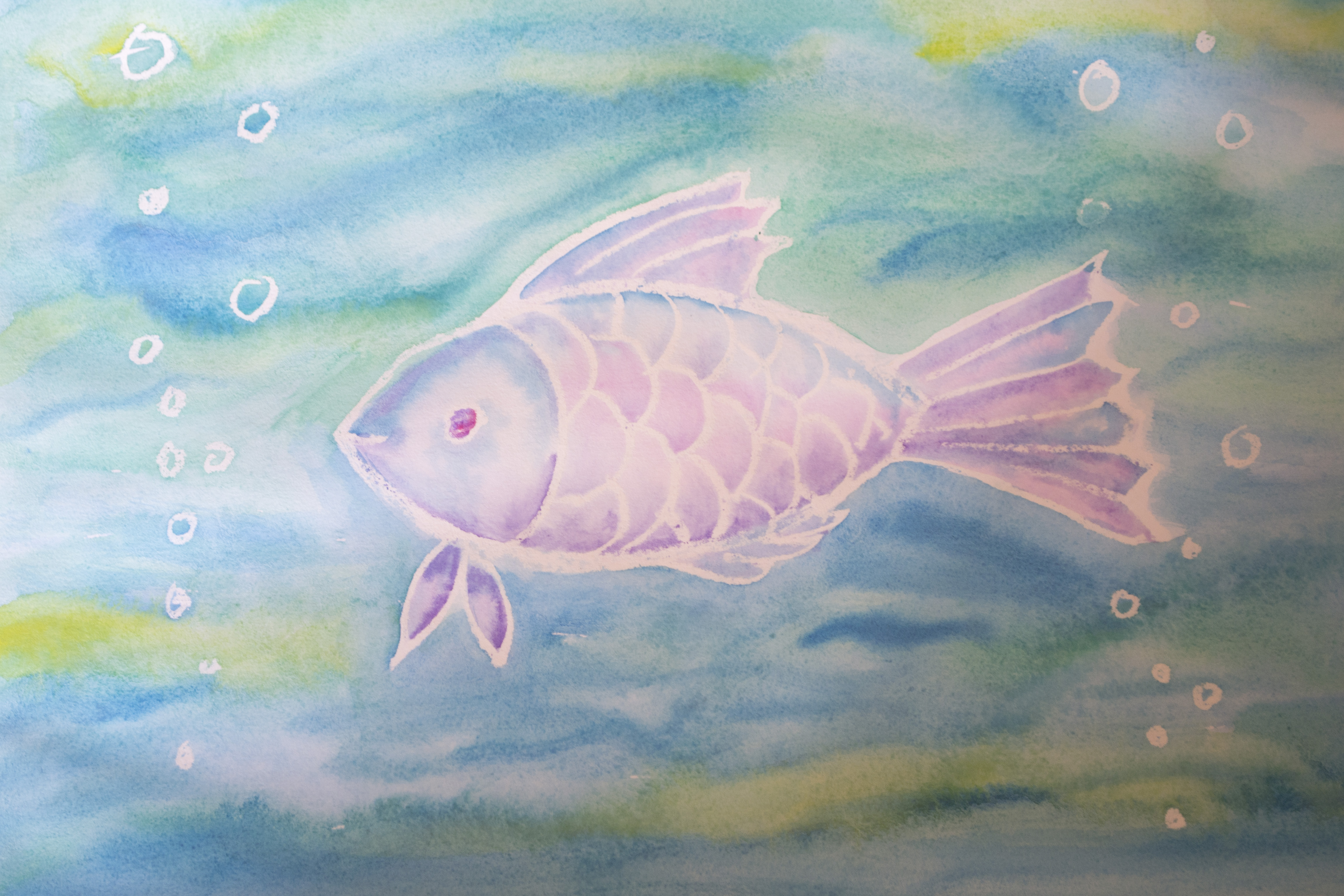 Работа к заданию "Смешанная техника". Я пыталась сделать фон более темным, используя тёплые тона, а рыбу светлой с помощью холодных тонов. Но в результате, мне кажется, что вода вышла слишком светлой для такой рыбки.