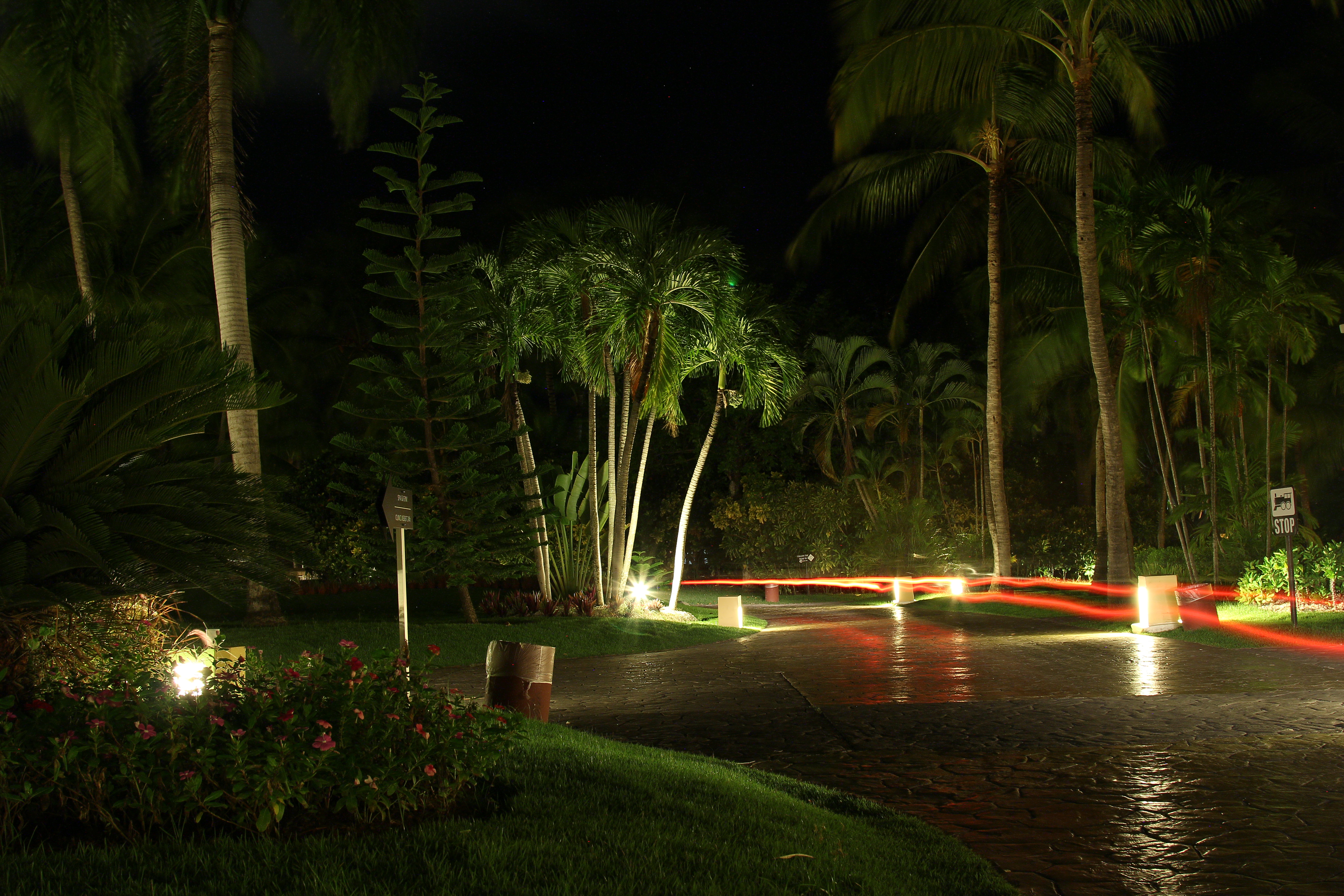 Общий ландшафт выглядит весьма живописно и лаконично, в частности за счёт точечной подсветки образующей удачные зрительные акценты. Плюс хорошо подсвечены стройные силуэты пальм и прочей растительности, здорово смотрятся матовые световые блики на фактурой дорожке.