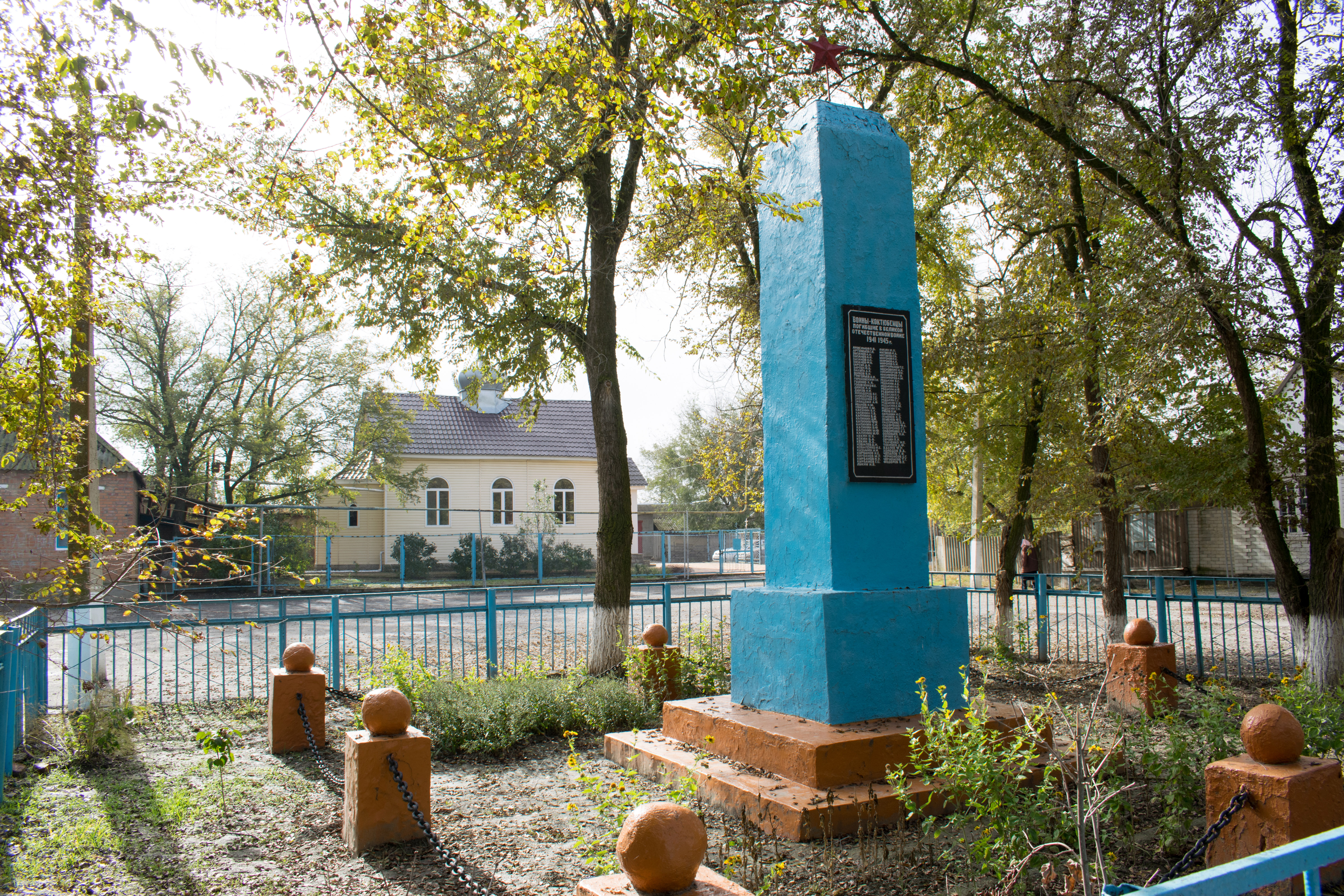 Осеннее утро. На переднем плане монумент павшим войнам в годы ВОВ, немного в далеке виднеется церковь. Фото сделано в селе Коктюбей, Дагестан.