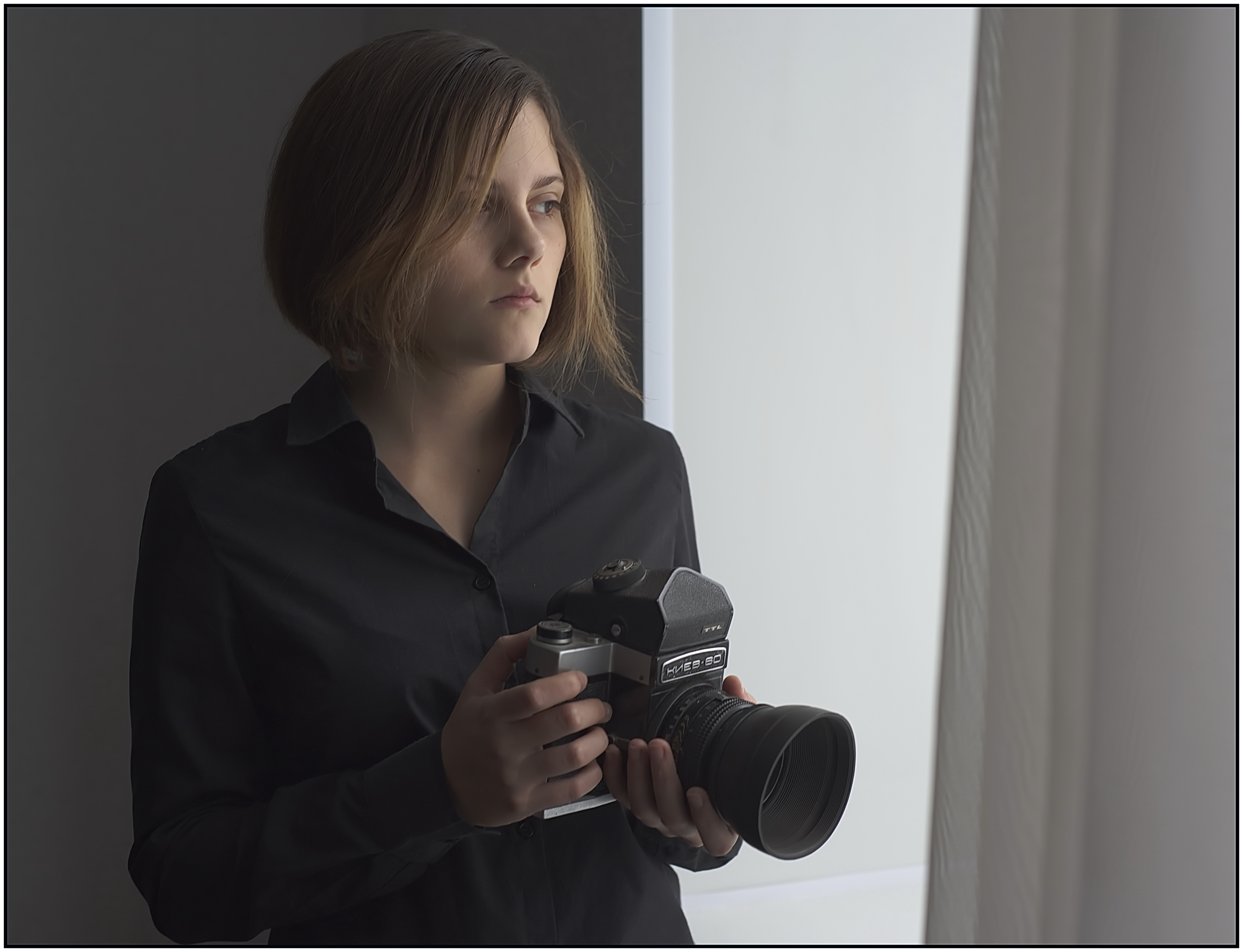 Очень удачно выбрали освещение, мягкий рассеянный свет позволил добиться плавных тональных переходов и низкого контраста. Такой свет замечательно подходит для съёмки портретов, особенно женских. Взгляд направлен в сторону, но это волне допустимо, ведь по направлению взгляда оставлено достаочно визуального пространства. Взгляд скользит за пределы кадра и снимок получается недосказанным.