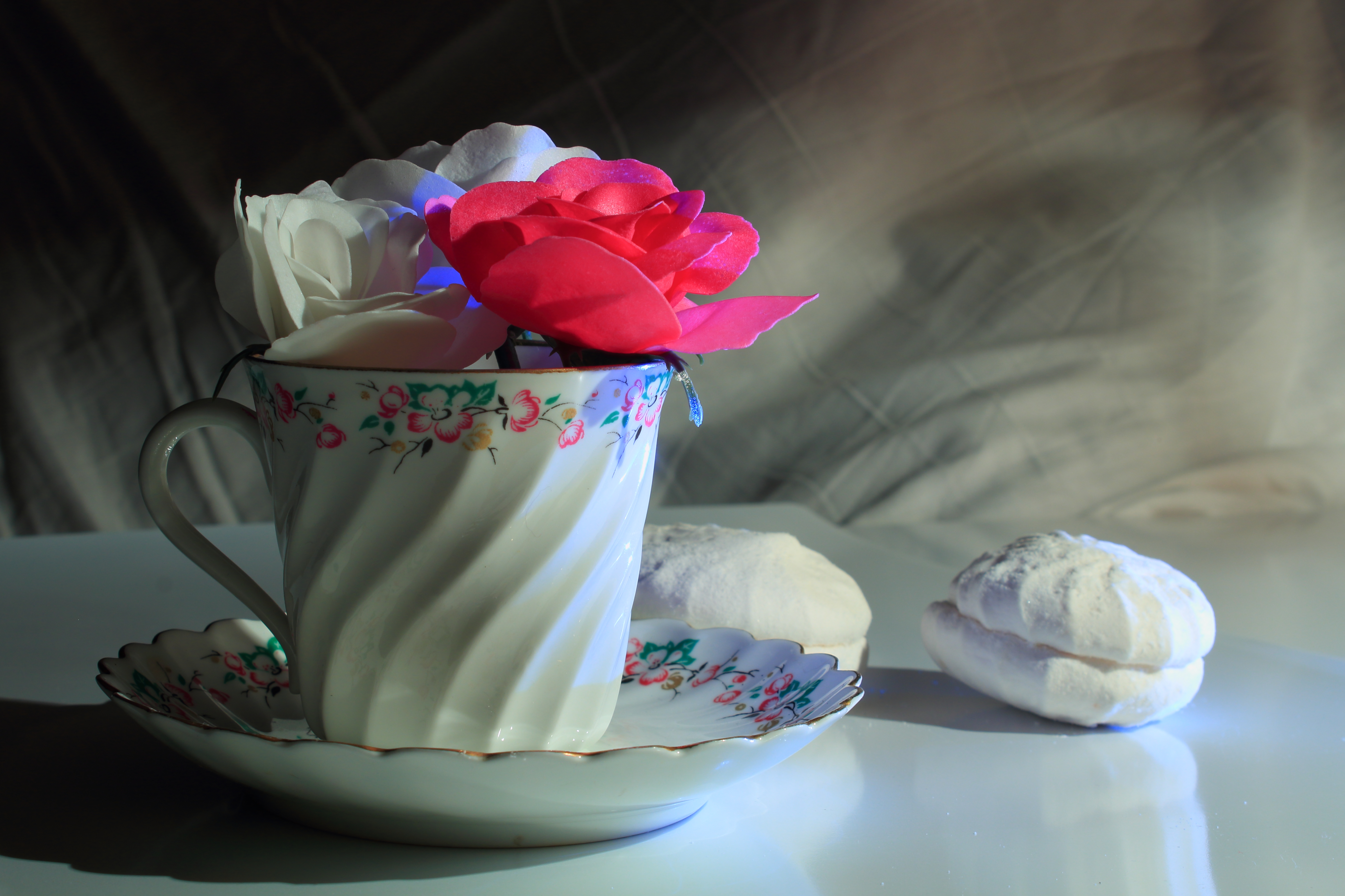 Боковое освещение помогает передать фактуру ткани, самих объектов. Так здорово показаны грани кружки(1,2). А контровой свет подчеркнул фактуру лепестков(3), усилил их объём.