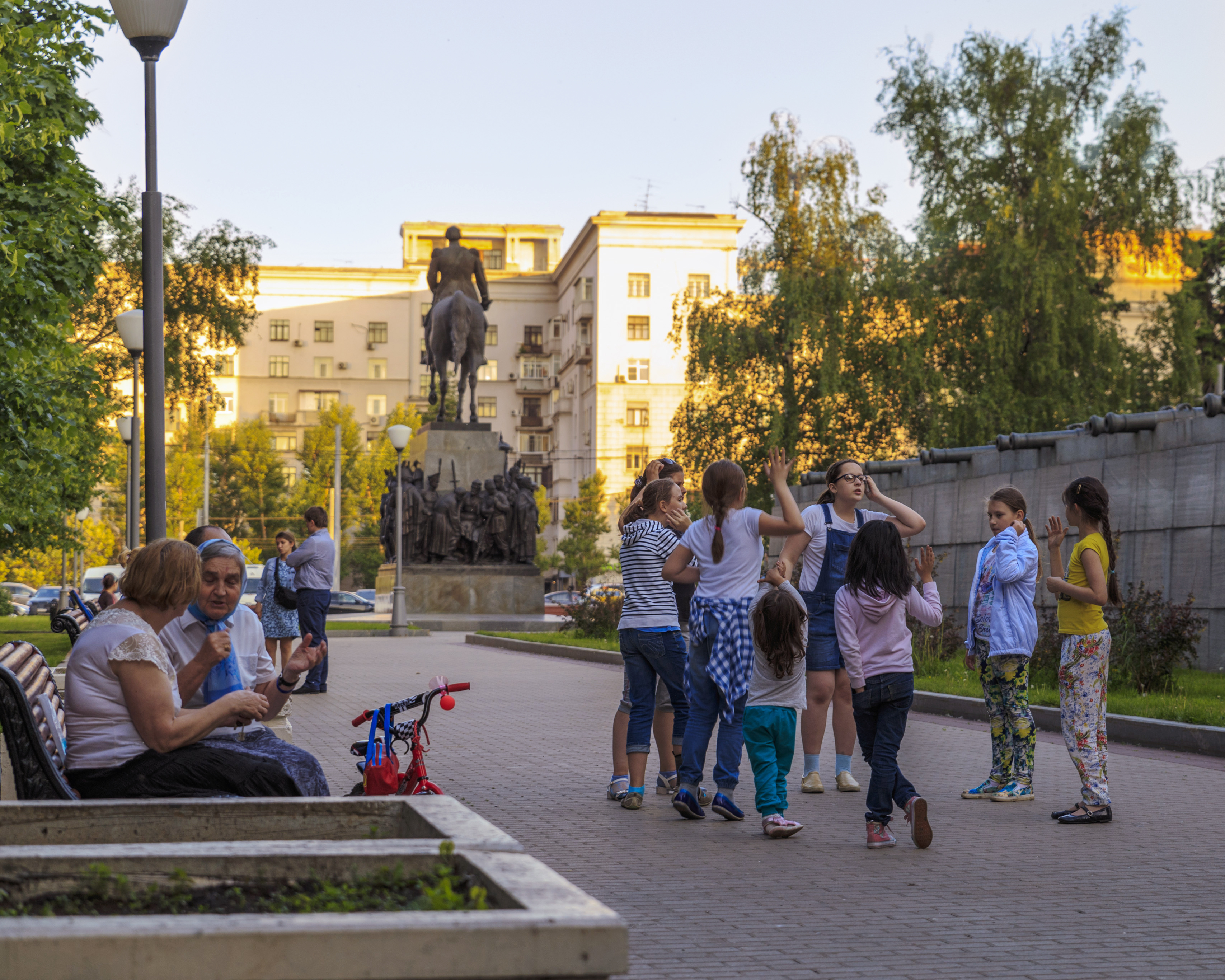 Эту фотографию сделала в начале лета, в первый день каникул. Знаю свои ошибки и выдержка длинновата для динамичных девочек и небо было пробито. Если с небо немного подправила, то одну смазанную девочку уже ничем не исправишь. Все равно мне нравится сценка: девочки играют, собравшись кружком, а бабушки ведут беседу.